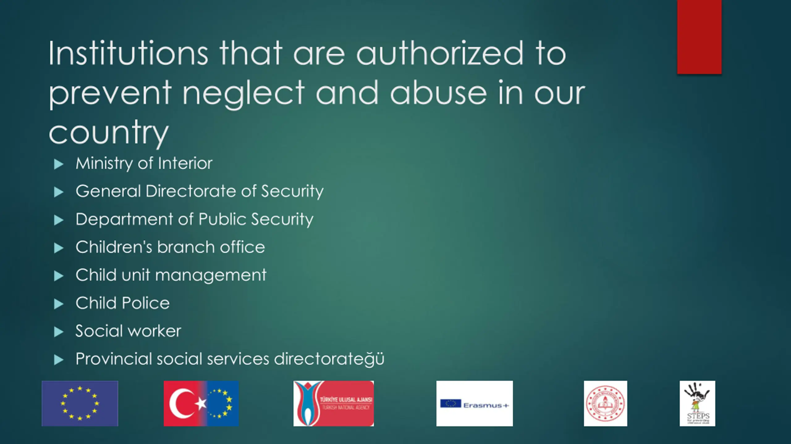 Institutions that are authorized to prevent neglect and abuse in our country Ministry of Interior General Directorate of Security Department of Public Security Children's branch office Child unit management Child Police Social worker Provincial social services directorate