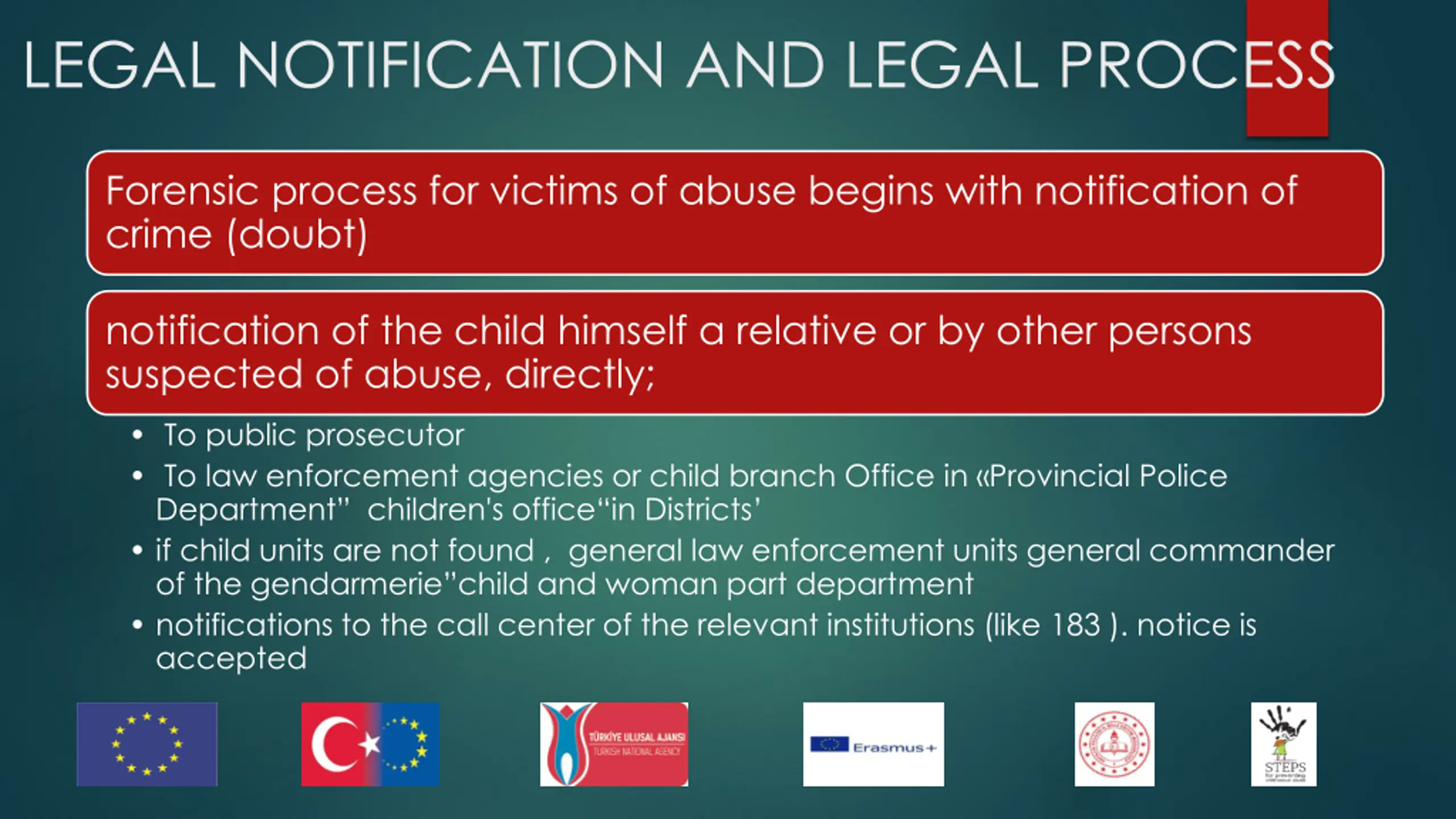 LEGAL NOTIFICATION AND LEGAL PROCESS Forensic process for victims of abuse begins with notification of crime (doubt) notification of the child himself a relative or by other persons suspected of abuse, directly; To public prosecutor To law enforcement agencies or child branch Office in Provincial Police Department children's office in Districts if child units are not found , general law enforcement units general commander of the gendarmerie child and woman part department notifications to the call center of the relevant institutions (like 183 ). notice is accepted