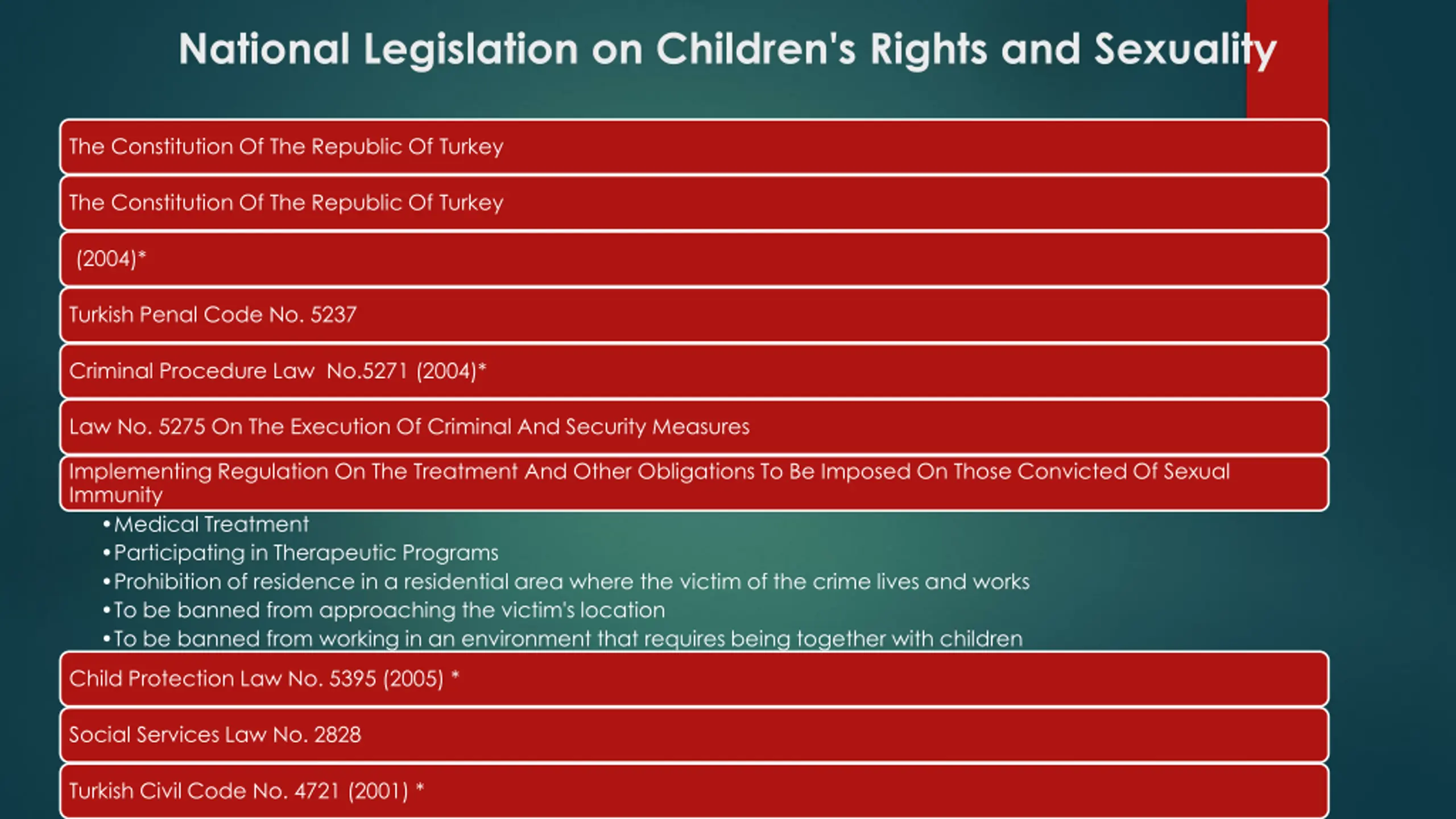 National Legislation on Children's Rights and Sexuality The Constitution Of The Republic Of Turkey The Constitution Of The Republic Of Turkey (2004)* Turkish Penal Code No. 5237 Criminal Procedure Law No.5271 (2004)* Law No. 5275 On The Execution Of Criminal And Security Measures Implementing Regulation On The Treatment And Other Obligations To Be Imposed On Those Convicted Of Sexual Immunity Medical Treatment Participating in Therapeutic Programs Prohibition of residence in a residential area where the victim of the crime lives and works To be banned from approaching the victim's location To be banned from working in an environment that requires being together with children Prohibition of performing activities requiring children to care and supervision Child Protection Law No. 5395 (2005) * Social Services Law No. 2828 Turkish Civil Code No. 4721 (2001) *