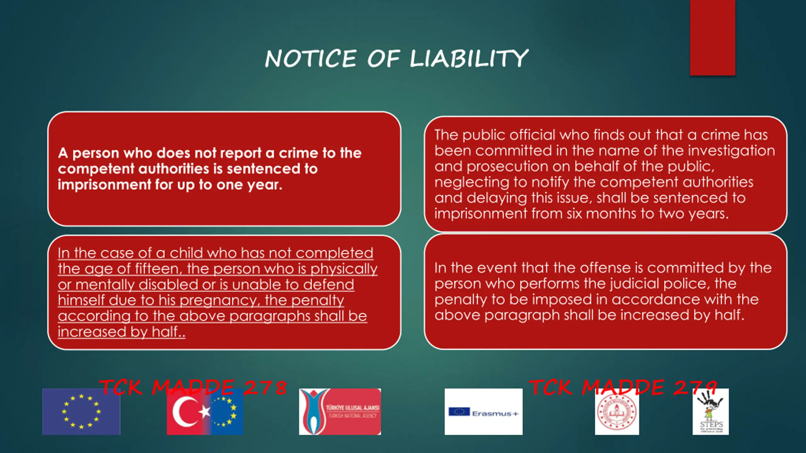 NOTICE OF LIABILITY The public official who finds out that a crime has been committed in the name of the investigation and prosecution on behalf of the public, neglecting to notify the competent authorities and delaying this issue, shall be sentenced to imprisonment from six months to two years. A person who does not report a crime to the competent authorities is sentenced to imprisonment for up to one year. In the case of a child who has not completed the age of fifteen, the person who is physically or mentally disabled or is unable to defend himself due to his pregnancy, the penalty according to the above paragraphs shall be increased by half.. In the event that the offense is committed by the person who performs the judicial police, the penalty to be imposed in accordance with the above paragraph shall be increased by half. TCK MADDE 278 TCK MADDE 279