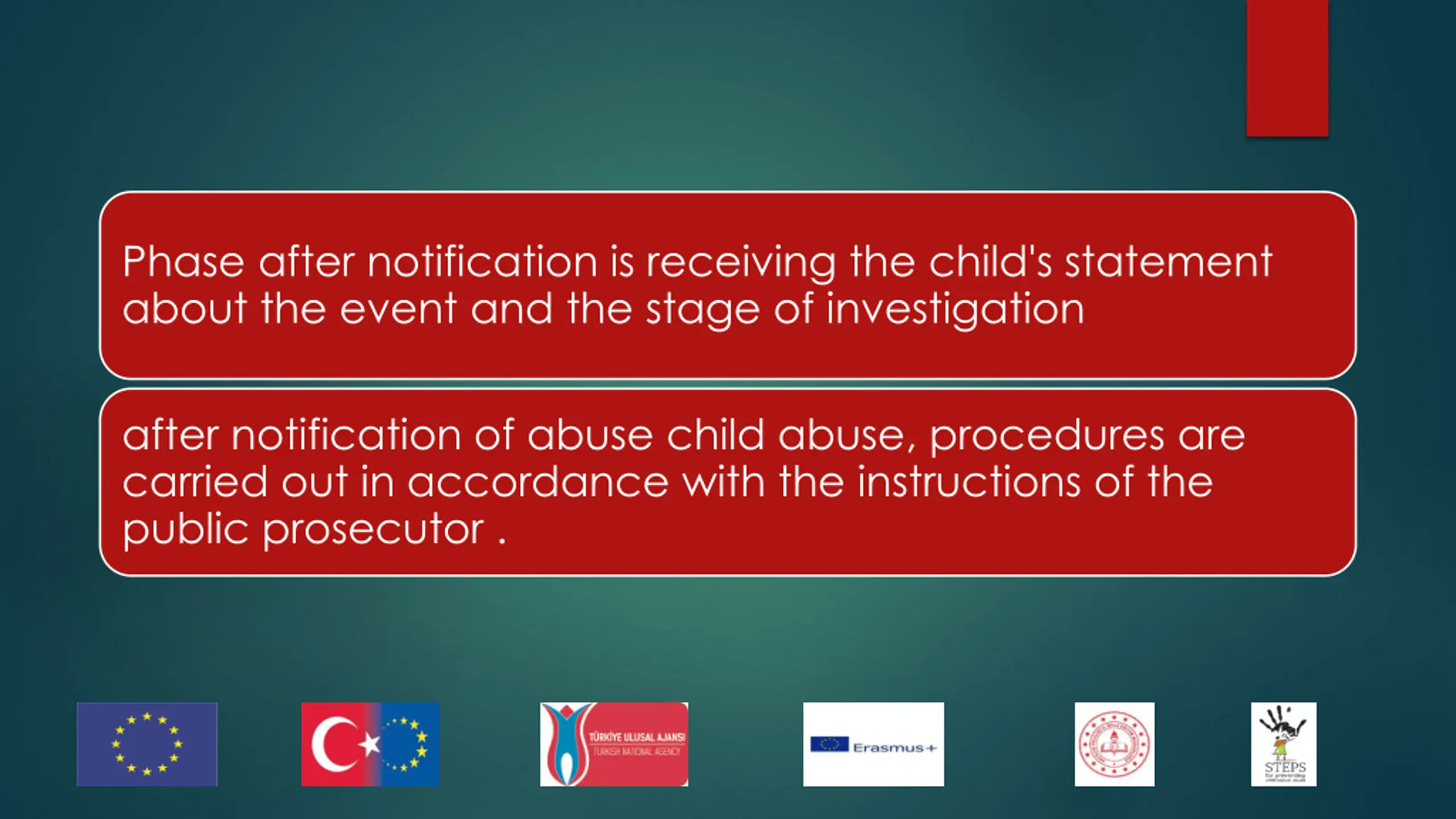 Phase after notification is receiving the child's statement about the event and the stage of investigation after notification of abuse child abuse, procedures are carried out in accordance with the instructions of the public prosecutor .