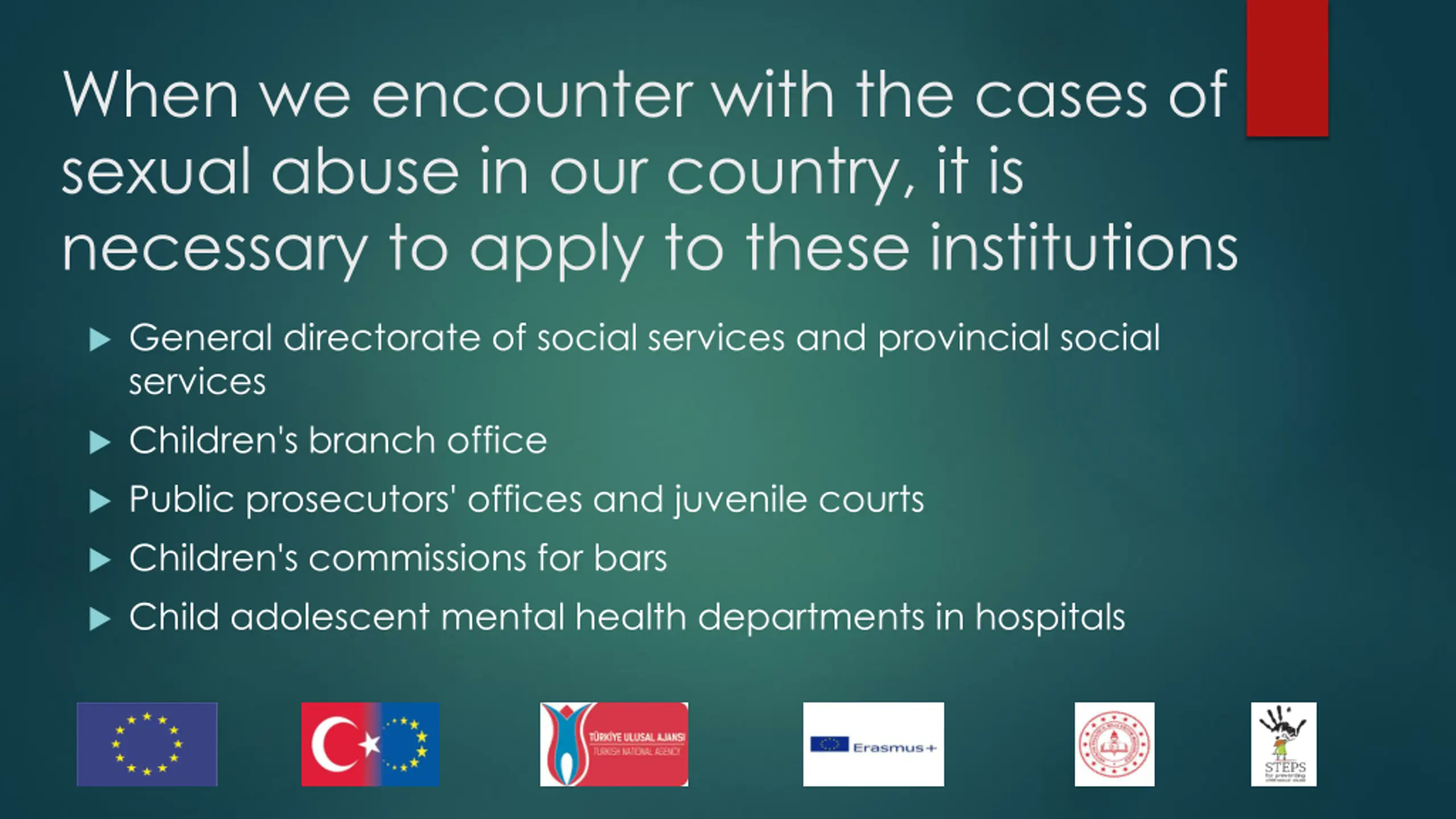 When we encounter with the cases of sexual abuse in our country, it is necessary to apply to these institutions General directorate of social services and provincial social services Children's branch office Public prosecutors' offices and juvenile courts Children's commissions for bars Child adolescent mental health departments in hospitals