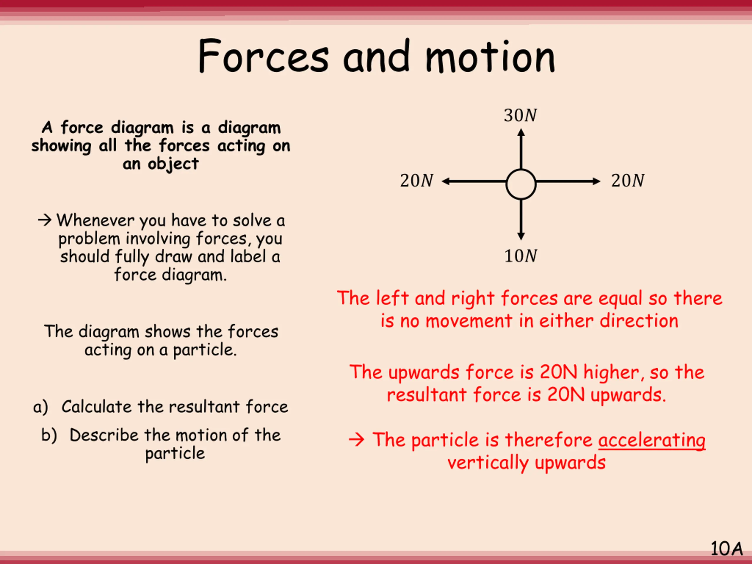 Forces and motion 30? A force diagram is a diagram showing all the forces acting on an object 20? 20? Whenever you have to solve a problem involving forces, you should fully draw and label a force diagram. 10? It is really important to note that a resultant force in a particular direction will cause acceleration in that direction The diagram shows the forces acting on a particle. If there is no resultant force (such as left/right in the diagram above), then the particle could be stationary or moving at a constant velocity a) Calculate the resultant force b) Describe the motion of the particle 10A