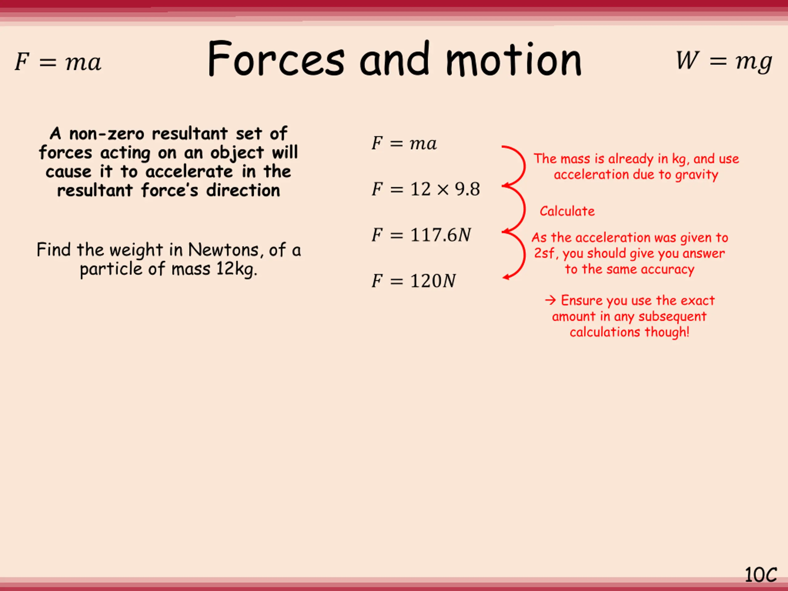 Forces and motion ? = ?? ? = ?? A non-zero resultant set of forces acting on an object will cause it to accelerate in the resultant force s direction ? = ?? The mass is already in kg, and use acceleration due to gravity ? = 12 9.8 Calculate ? = 117.6? As the acceleration was given to 2sf, you should give you answer to the same accuracy Find the weight in Newtons, of a particle of mass 12kg. ? = 120? Ensure you use the exact amount in any subsequent calculations though! 10C