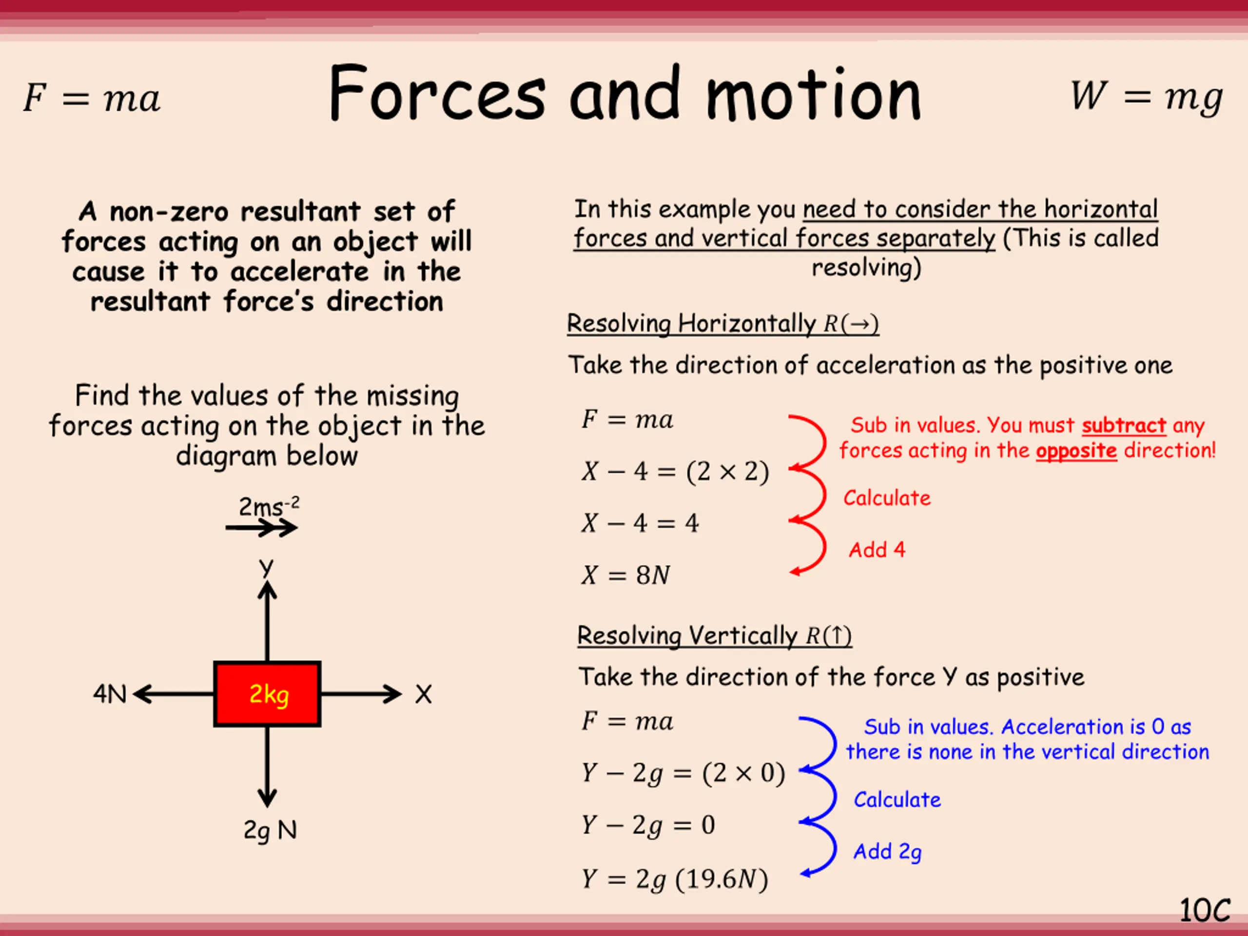 Forces and motion A non-zero resultant set of forces acting on an object will cause it to accelerate in the resultant force s direction ? = ?? ? = ?? The weight is the force caused by gravity The value g is the acceleration due to gravity 10C