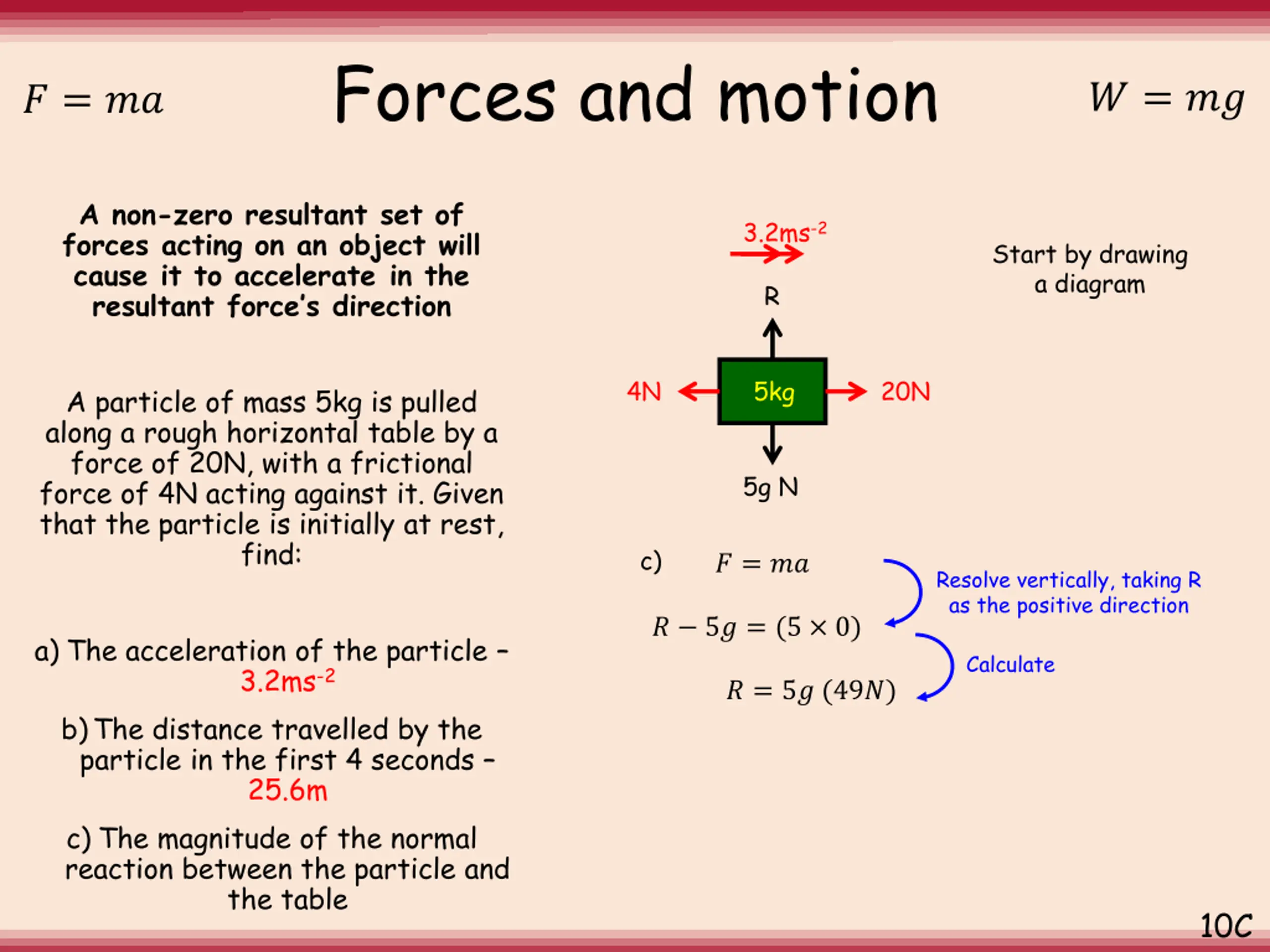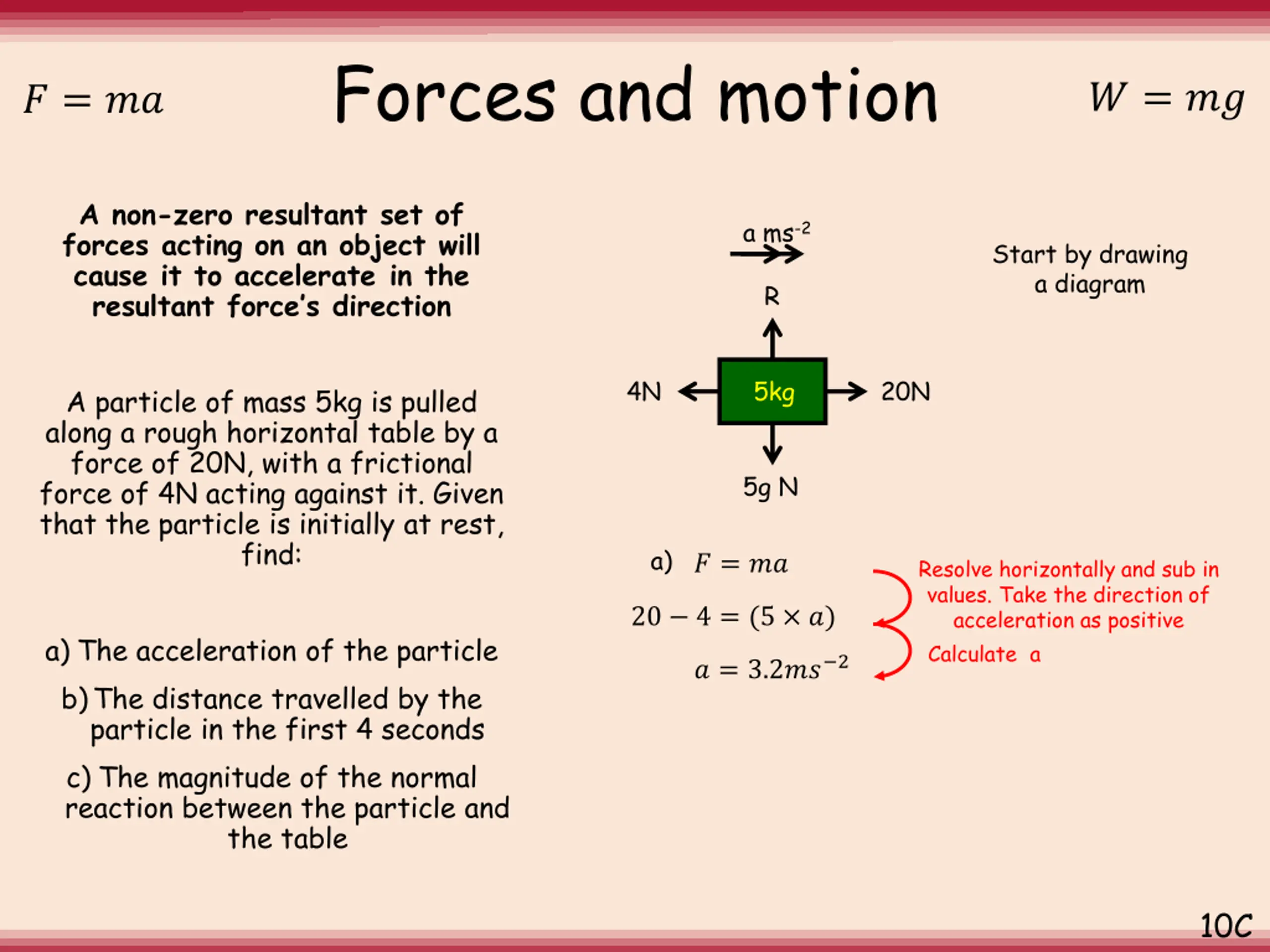 Forces and motion ? = ?? ? = ?? A non-zero resultant set of forces acting on an object will cause it to accelerate in the resultant force s direction a ms-2 Start by drawing a diagram R 4N 5kg 20N A particle of mass 5kg is pulled along a rough horizontal table by a force of 20N, with a frictional force of 4N acting against it. Given that the particle is initially at rest, find: 5g N a) ? = ?? Resolve horizontally and sub in values. Take the direction of acceleration as positive Calculate a 20 4 = (5 ?) a) The acceleration of the particle b)The distance travelled by the particle in the first 4 seconds c) The magnitude of the normal reaction between the particle and the table ? = 3.2?? 2 10C