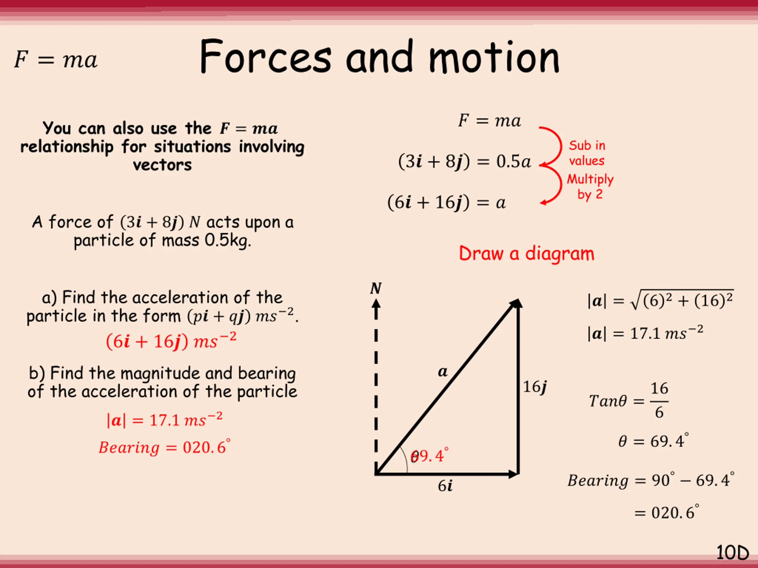 Forces and motion ? = ?? ? = ?? You can also use the ? = ?? relationship for situations involving vectors Sub in values Multiply by 2 3? + 8? = 0.5? 6? + 16? = ? A force of 3? + 8? ? acts upon a particle of mass 0.5kg. Draw a diagram ? a) Find the acceleration of the particle in the form ?? + ?? ?? 2. 6? + 16? ?? 2 62+ 162 ? = ? = 17.1 ?? 2 b) Find the magnitude and bearing of the acceleration of the particle ? = 17.1 ?? 2 ??????? = 020.6 ? 16? ???? =16 6 ? = 69.4 ? 69.4 ??????? = 90 69.4 6? = 020.6 10D