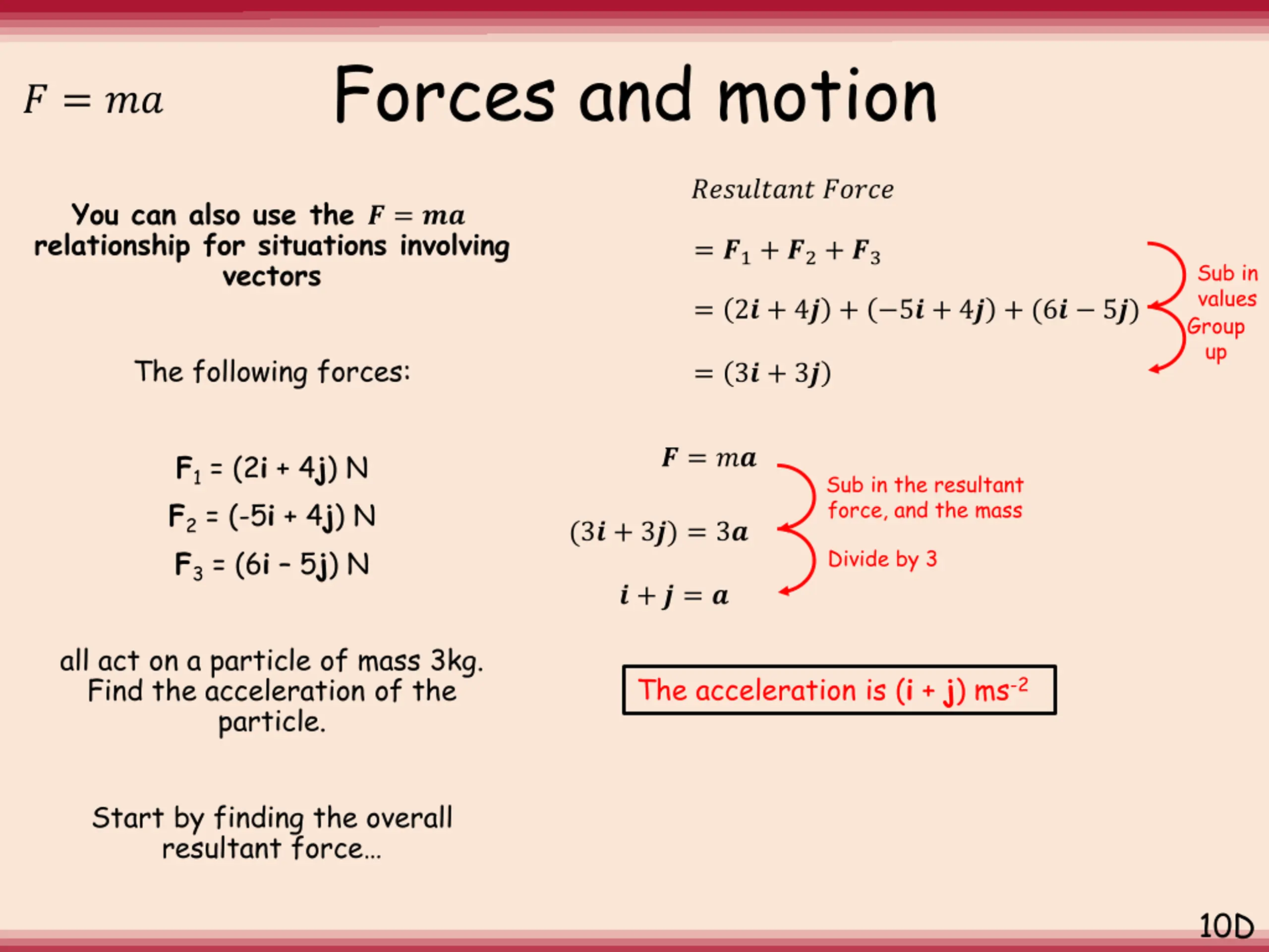 Forces and motion ? = ?? ????????? ????? You can also use the ? = ?? relationship for situations involving vectors = ?1+ ?2+ ?3 Sub in values Group up = 2? + 4? + 5? + 4? + (6? 5?) The following forces: = 3? + 3? ? = ?? F1 = (2i + 4j) N F2 = (-5i + 4j) N F3 = (6i 5j) N Sub in the resultant force, and the mass (3? + 3?) = 3? Divide by 3 ? + ? = ? all act on a particle of mass 3kg. Find the acceleration of the particle. The acceleration is (i + j) ms-2 Start by finding the overall resultant force 10D