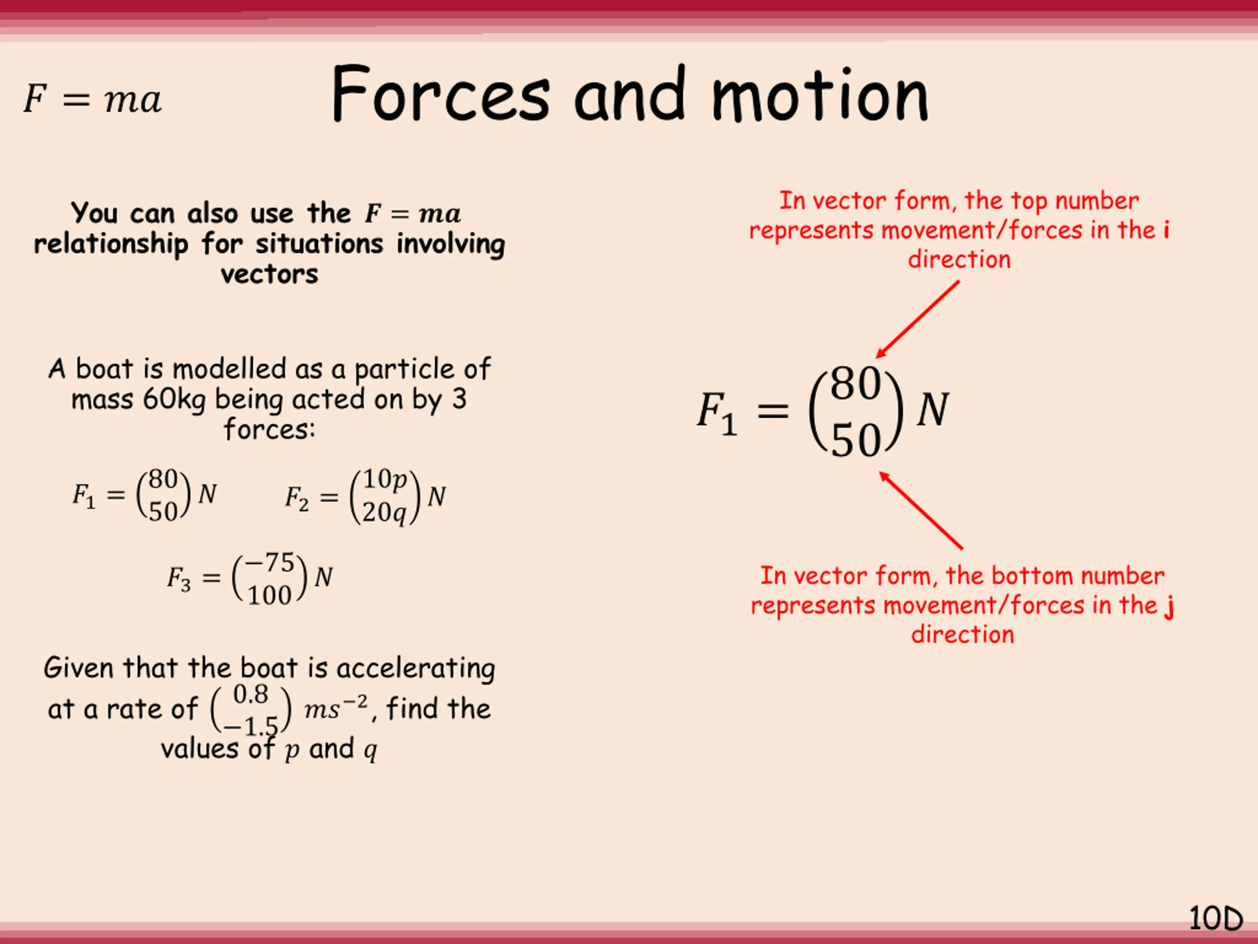 Forces and motion ? = ?? ????????? ????? You can also use the ? = ?? relationship for situations involving vectors = ?1+ ?2+ ?3 Sub in values 10? 20? 80 50 + 75 100 = + A boat is modelled as a particle of mass 60kg being acted on by 3 forces: Group up 10? + 5 20? + 150? = 10? 20?? 80 50 ?1= ? ?2= 75 100 ?3= ? Given that the boat is accelerating at a rate of 1.5 ?? 2, find the values of ? and ? 0.8 Find the resultant force first 10D