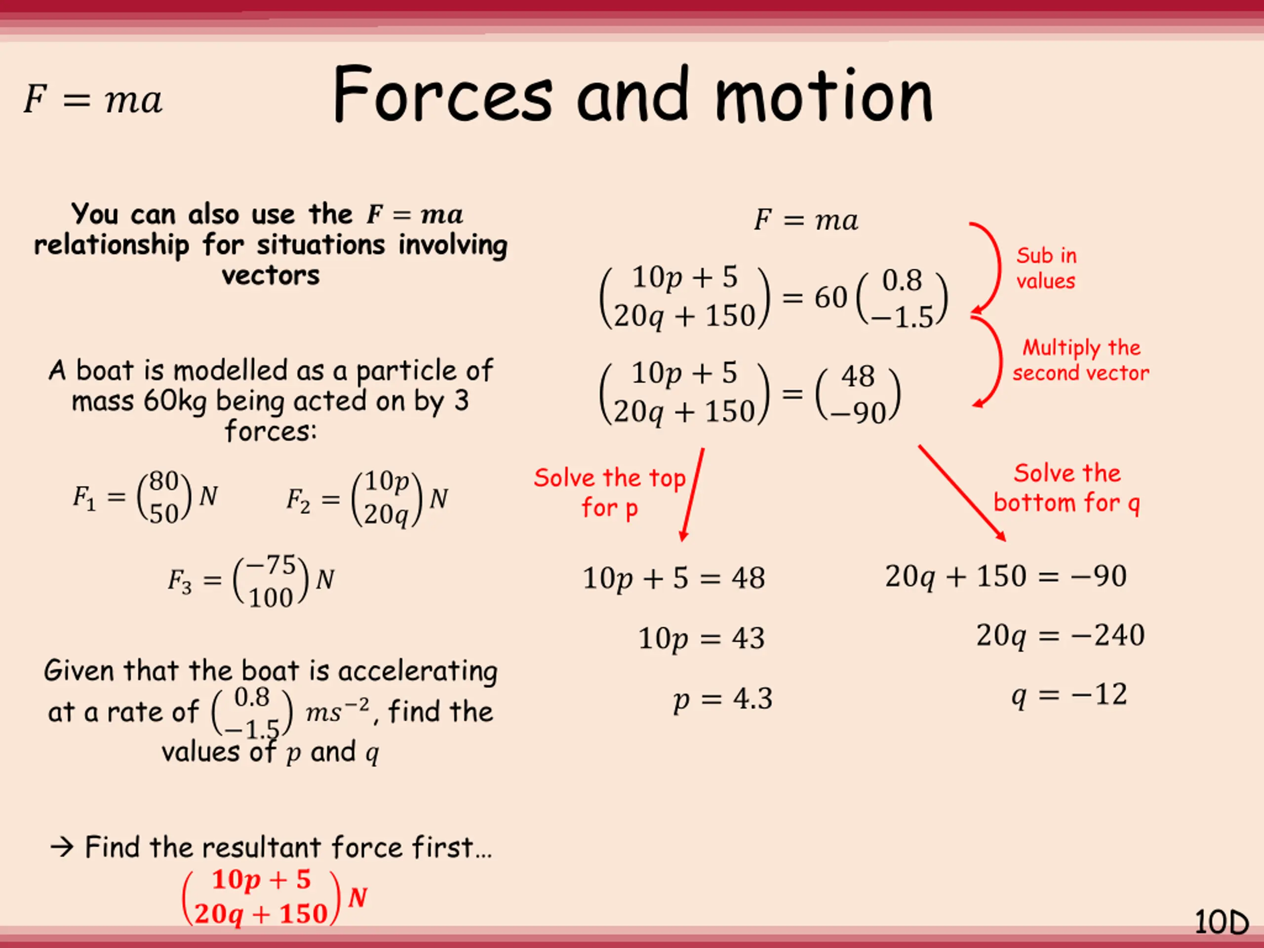 Forces and motion ? = ?? You can also use the ? = ?? relationship for situations involving vectors ? = ?? Sub in values 10? + 5 20? + 150 0.8 1.5 = 60 Multiply the second vector A boat is modelled as a particle of mass 60kg being acted on by 3 forces: 10? + 5 20? + 150 48 90 = Solve the bottom for q Solve the top for p 10? 20?? 80 50 ?1= ? ?2= 75 100 20? + 150 = 90 10? + 5 = 48 ?3= ? 20? = 240 10? = 43 Given that the boat is accelerating at a rate of 1.5 ?? 2, find the values of ? and ? ? = 12 0.8 ? = 4.3 Find the resultant force first ??? + ? ??? + ???? 10D