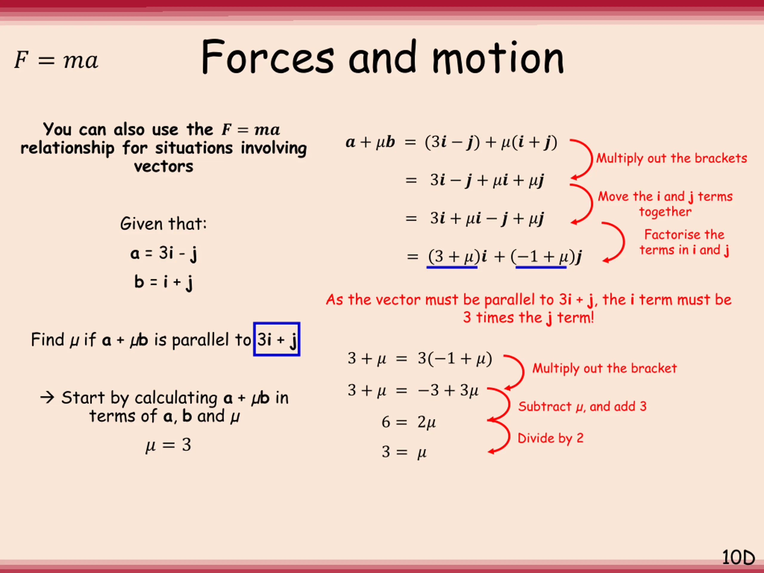 Forces and motion ? = ?? You can also use the ? = ?? relationship for situations involving vectors ? + ?? = (3? ?) + ?(? + ?) Multiply out the brackets = 3? ? + ?? + ?? Move the i and j terms together Factorise the terms in i and j = 3? + ?? ? + ?? Given that: a = 3i - j b = i + j = 3 + ? ? + 1 + ? ? As the vector must be parallel to 3i + j, the i term must be 3 times the j term! Find if a + b is parallel to 3i + j 3 + ? = 3( 1 + ?) Multiply out the bracket 3 + ? = 3 + 3? Start by calculating a + b in terms of a, b and ? = 3 Subtract , and add 3 6 = 2? Divide by 2 3 = ? 10D