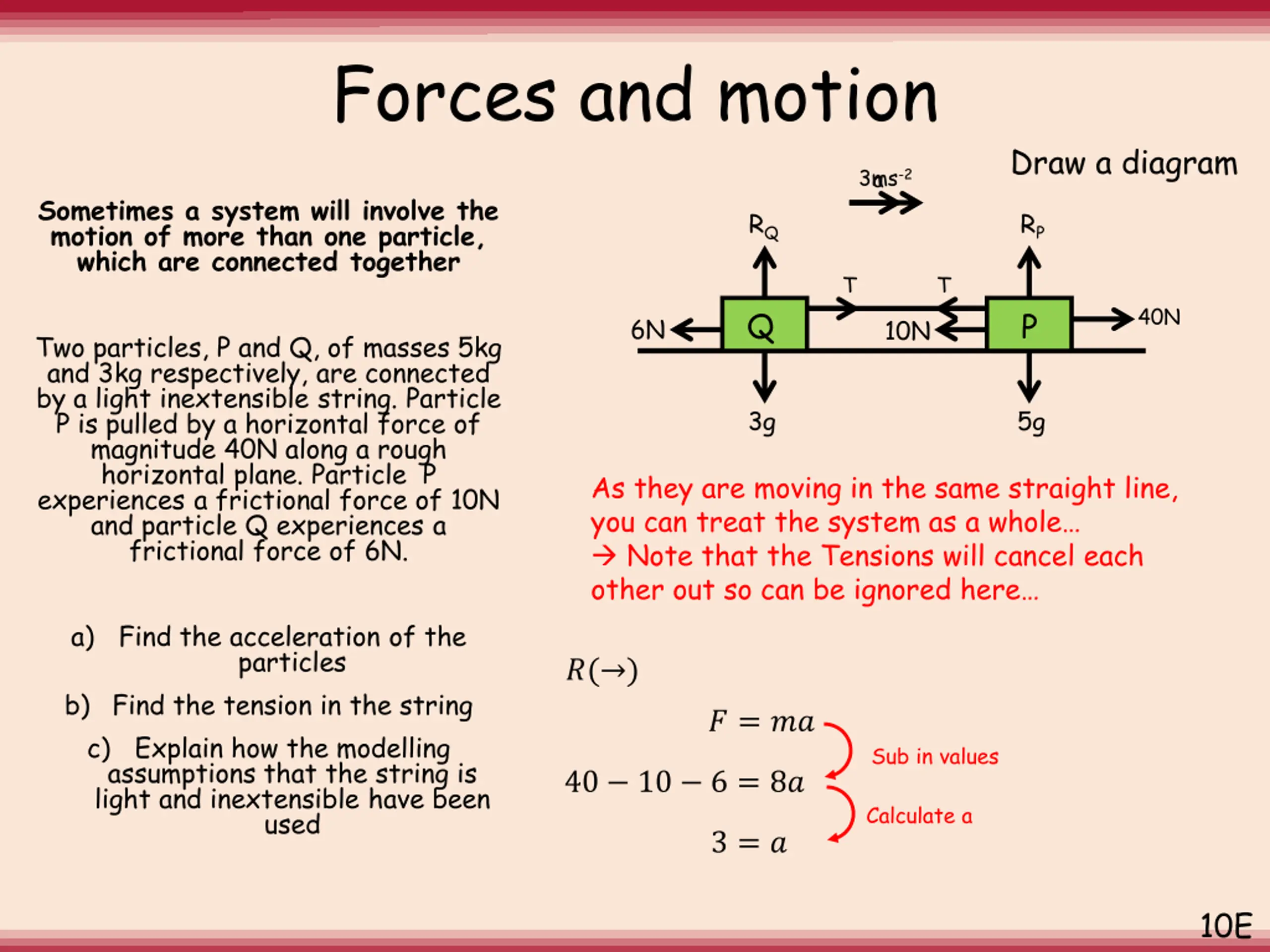 Forces and motion Draw a diagram 3ms-2 a Sometimes a system will involve the motion of more than one particle, which are connected together RQ RP T T 40N Q P 6N 10N Two particles, P and Q, of masses 5kg and 3kg respectively, are connected by a light inextensible string. Particle P is pulled by a horizontal force of magnitude 40N along a rough horizontal plane. Particle P experiences a frictional force of 10N and particle Q experiences a frictional force of 6N. 3g 5g As they are moving in the same straight line, you can treat the system as a whole Note that the Tensions will cancel each other out so can be ignored here Find the acceleration of the particles b) Find the tension in the string c) Explain how the modelling assumptions that the string is light and inextensible have been used a) ?( ) ? = ?? Sub in values 40 10 6 = 8? Calculate a 3 = ? 10E