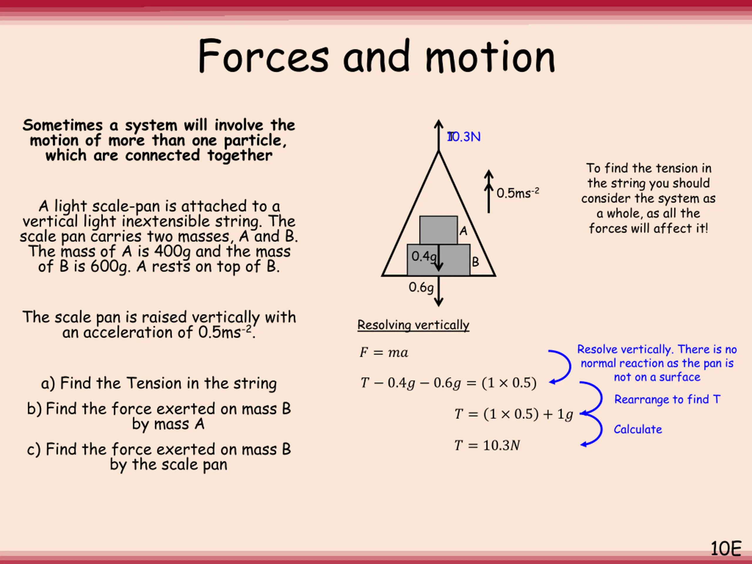 Forces and motion Sometimes a system will involve the motion of more than one particle, which are connected together T 10.3N To find the tension in the string you should consider the system as a whole, as all the forces will affect it! 0.5ms-2 A light scale-pan is attached to a vertical light inextensible string. The scale pan carries two masses, A and B. The mass of A is 400g and the mass of B is 600g. A rests on top of B. A 0.4g B 0.6g The scale pan is raised vertically with an acceleration of 0.5ms-2. Resolving vertically Resolve vertically. There is no normal reaction as the pan is not on a surface ? = ?? a) Find the Tension in the string b) Find the force exerted on mass B by mass A c) Find the force exerted on mass B by the scale pan ? 0.4? 0.6? = (1 0.5) Rearrange to find T ? = 1 0.5 + 1? Calculate ? = 10.3? 10E