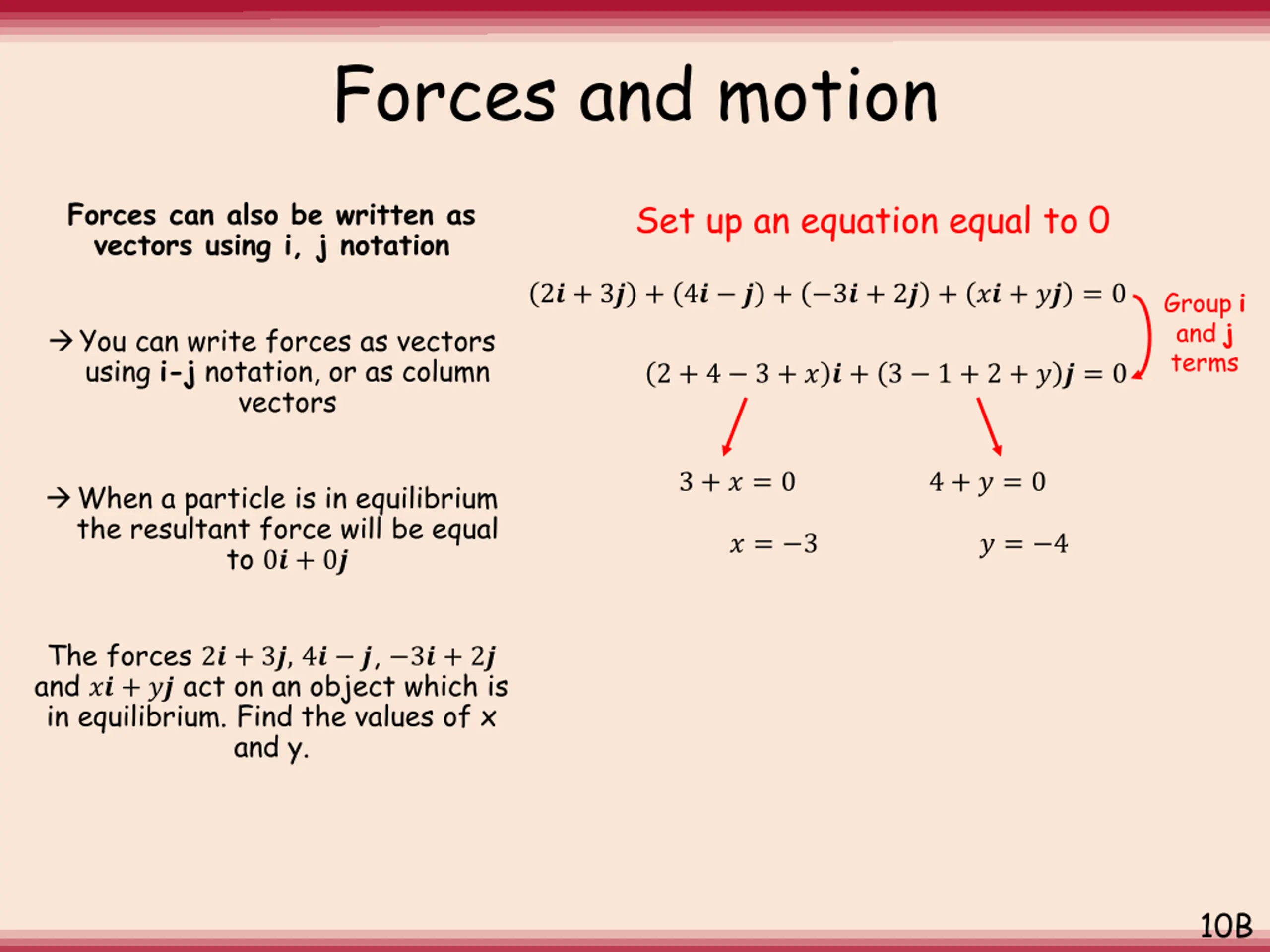 Forces and motion Forces can also be written as vectors using i, j notation Set up an equation equal to 0 2? + 3? + 4? ? + 3? + 2? + ?? + ?? = 0 Group i and j terms You can write forces as vectors using i-j notation, or as column vectors 2 + 4 3 + ? ? + 3 1 + 2 + ? ? = 0 3 + ? = 0 4 + ? = 0 When a particle is in equilibrium the resultant force will be equal to 0? + 0? ? = 3 ? = 4 The forces 2? + 3?,4? ?, 3? + 2? and ?? + ?? act on an object which is in equilibrium. Find the values of x and y. 10B