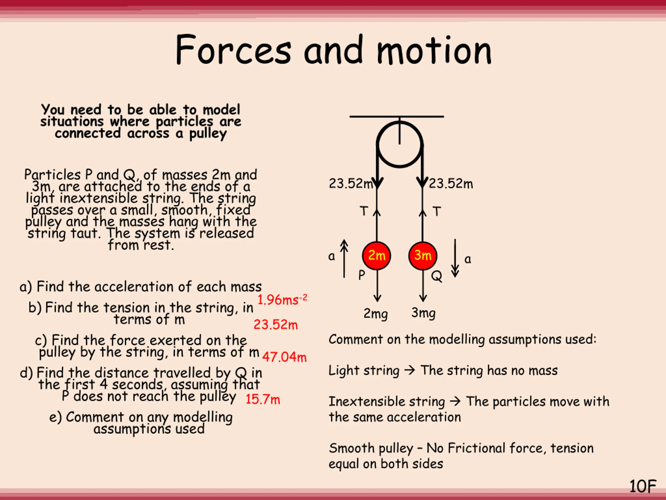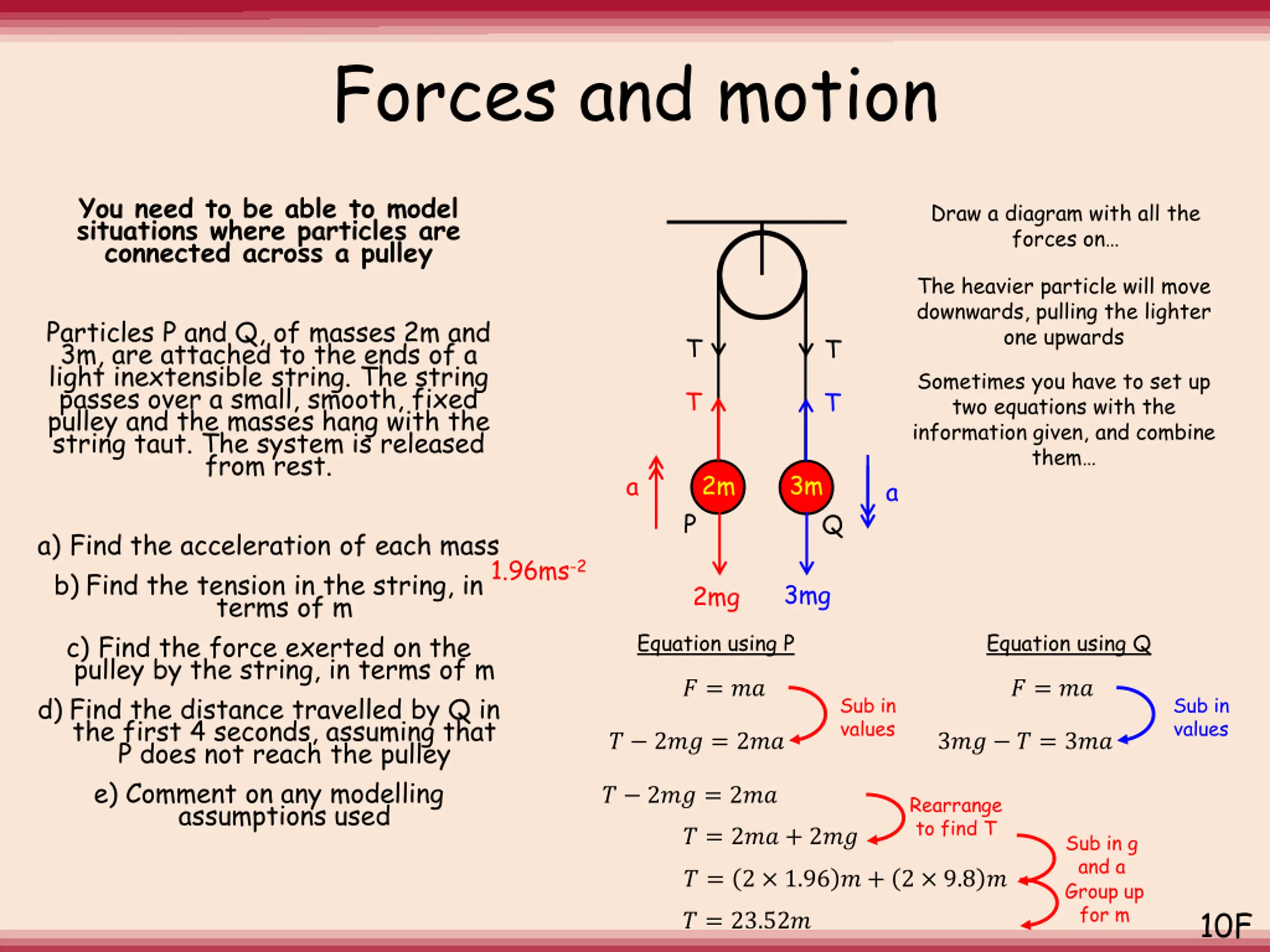Forces and motion You need to be able to model situations where particles are connected across a pulley Particles P and Q, of masses 2m and 3m, are attached to the ends of a light inextensible string. The string passes over a small, smooth, fixed pulley and the masses hang with the string taut. The system is released from rest. 23.52m 23.52m T T 3m 2m a a P Q a) Find the acceleration of each mass b) Find the tension in the string, in terms of m c) Find the force exerted on the pulley by the string, in terms of m d) Find the distance travelled by Q in the first 4 seconds, assuming that P does not reach the pulley e) Comment on any modelling assumptions used 1.96ms-2 3mg 2mg 23.52m Comment on the modelling assumptions used: 47.04m Light string The string has no mass 15.7m Inextensible string The particles move with the same acceleration Smooth pulley No Frictional force, tension equal on both sides 10F