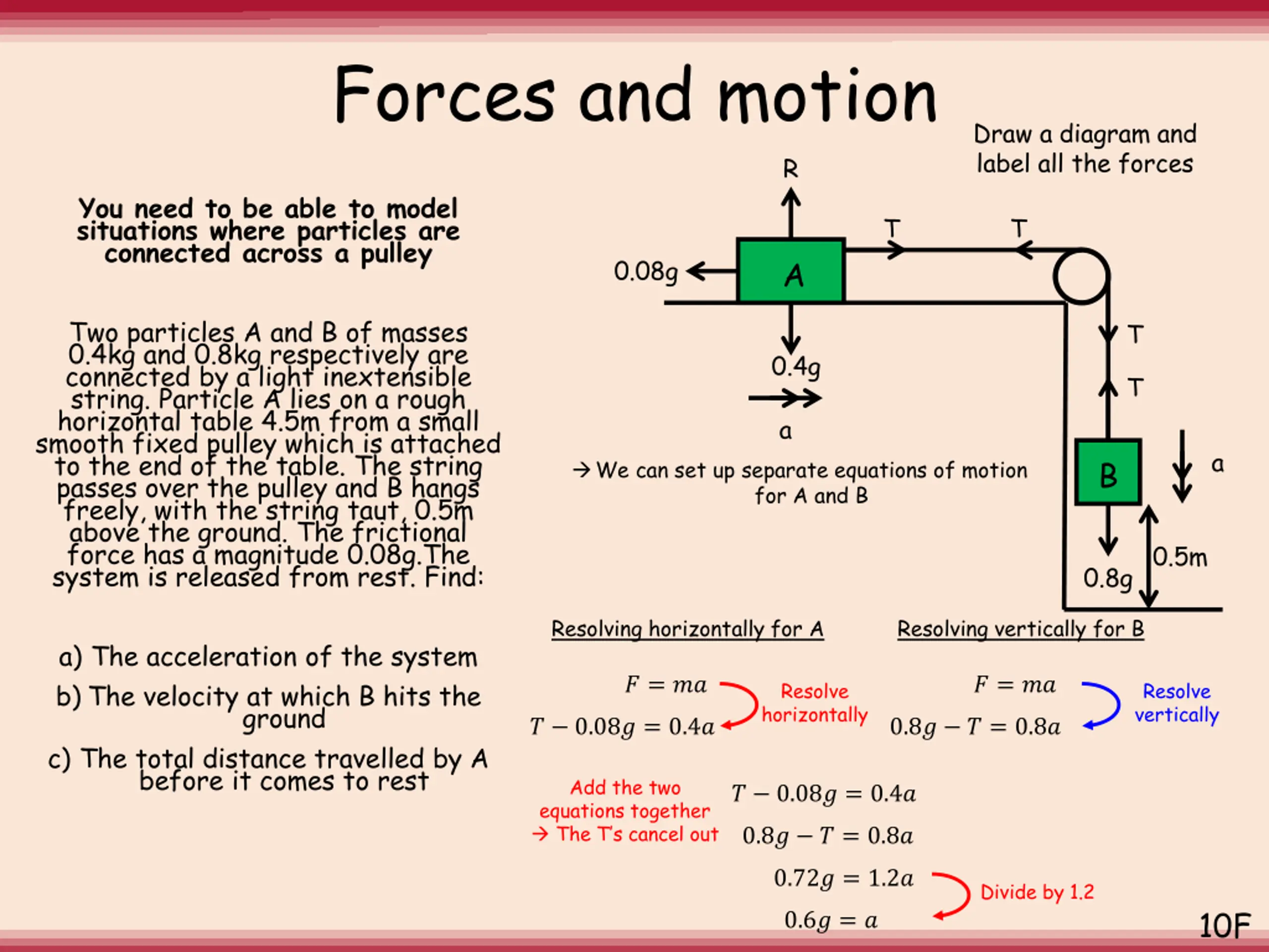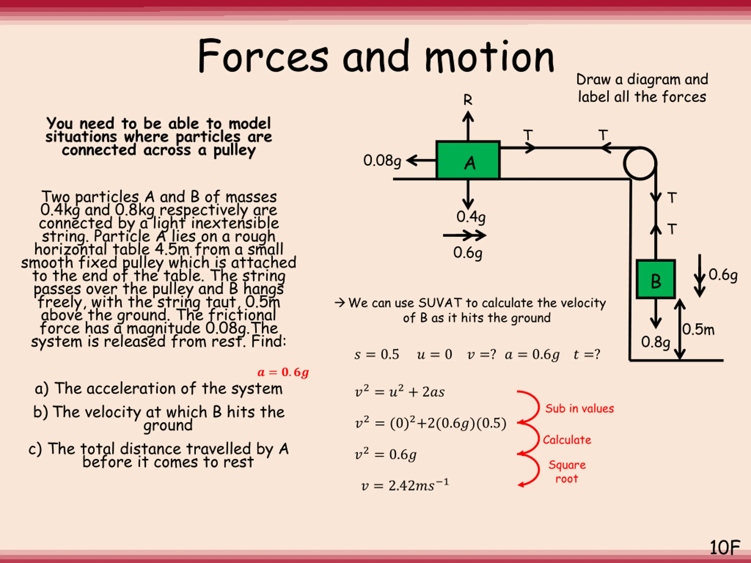 Forces and motion Draw a diagram and label all the forces R You need to be able to model situations where particles are connected across a pulley T T A 0.08g Two particles A and B of masses 0.4kg and 0.8kg respectively are connected by a light inextensible string. Particle A lies on a rough horizontal table 4.5m from a small smooth fixed pulley which is attached to the end of the table. The string passes over the pulley and B hangs freely, with the string taut, 0.5m above the ground. The frictional force has a magnitude 0.08g.The system is released from rest. Find: T 0.4g T 0.6g 0.6g B Particle A will travel 0.5m by the time B hits the floor 0.5m When B hits the floor, A will be moving at speed (the same as B as it hit the floor ) and will decelerate due to the frictional force We need to know the deceleration of a 0.8g ? = ?.?? a) The acceleration of the system b) The velocity at which B hits the ground c) The total distance travelled by A before it comes to rest ? = ?? Resolve horizontally for A ? = ?.???? ? ? 0.08? = (0.4 ?) T = 0 now as the string will be slack 0 0.08? = 0.4? Divide by 0.4 0.2? = ? 10F