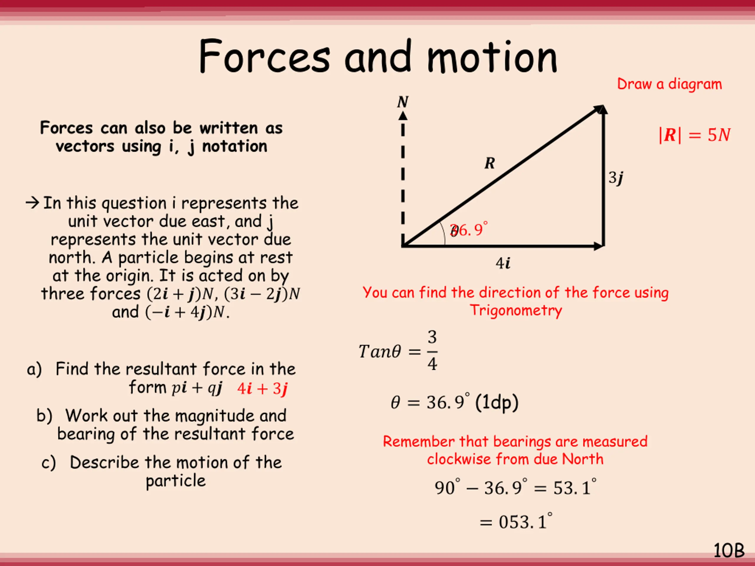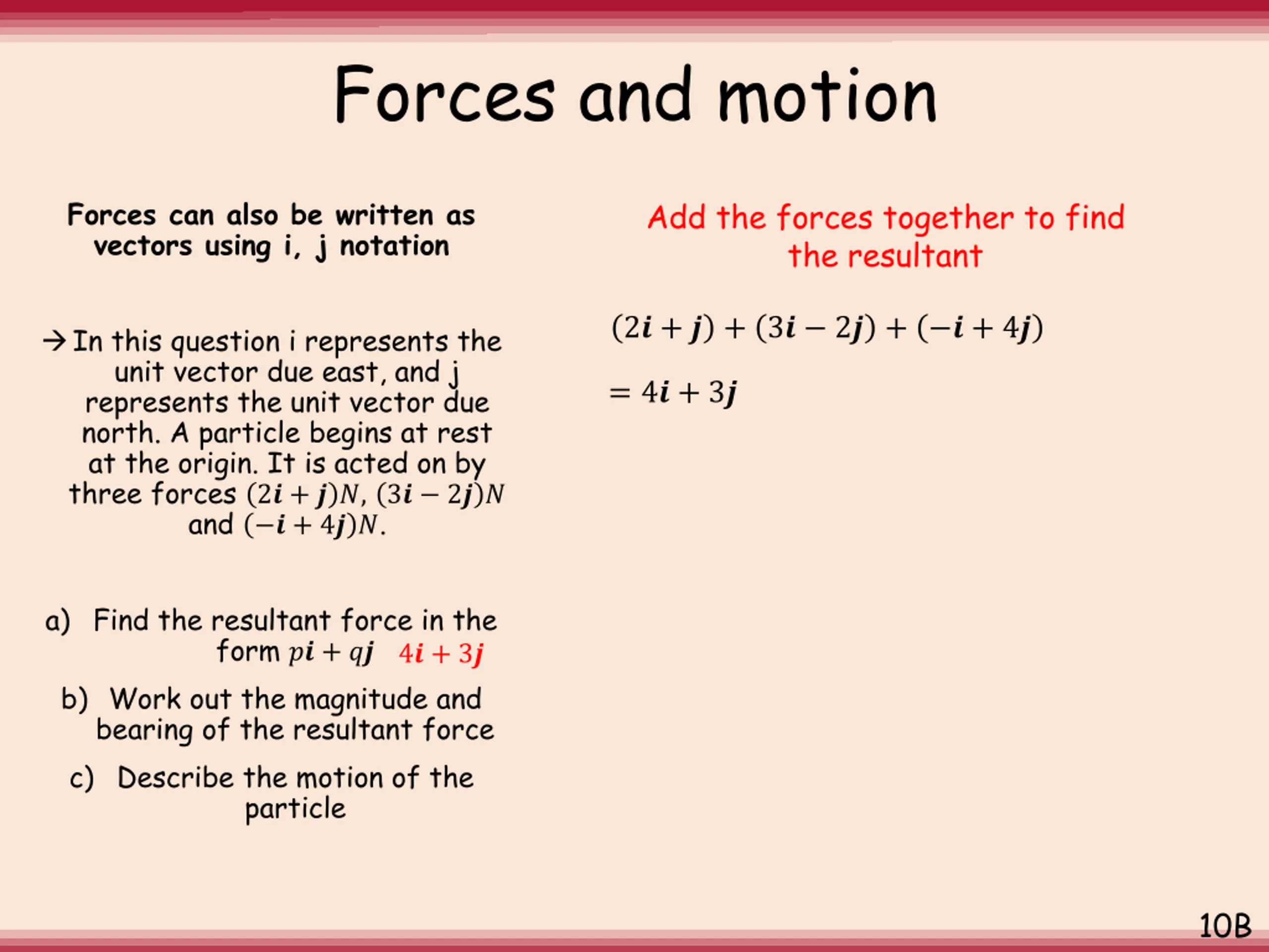 Forces and motion Forces can also be written as vectors using i, j notation The particle is accelerating in the direction of the resultant force In this question i represents the unit vector due east, and j represents the unit vector due north. A particle begins at rest at the origin. It is acted on by three forces 2? + ? ?, 3? 2? ? and ? + 4? ?. a) Find the resultant force in the form ?? + ?? b) Work out the magnitude and bearing of the resultant force c) Describe the motion of the particle 4? + 3? Bearing = 053.1 ? = 5? 10B