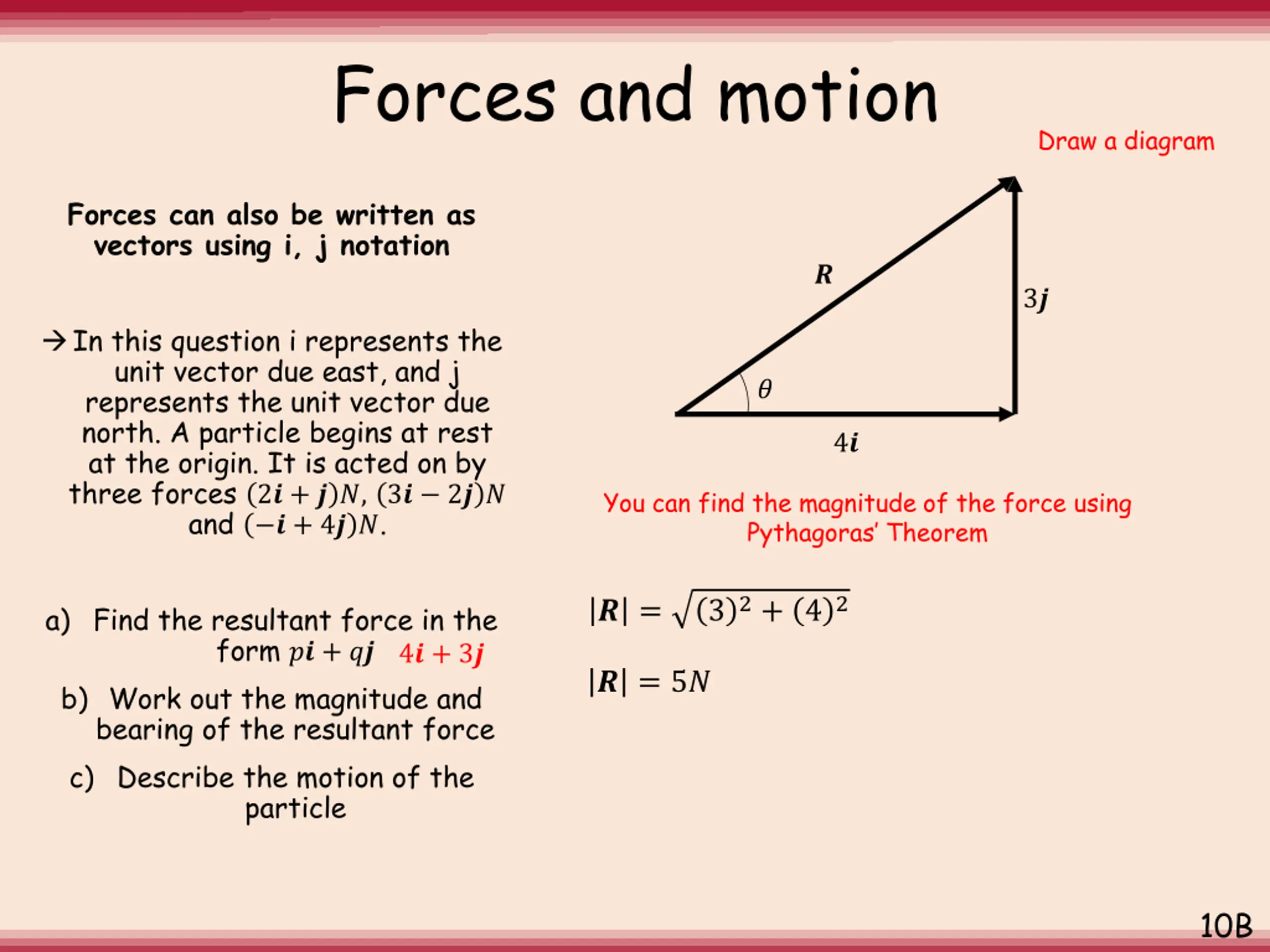 Forces and motion Draw a diagram Forces can also be written as vectors using i, j notation ? 3? In this question i represents the unit vector due east, and j represents the unit vector due north. A particle begins at rest at the origin. It is acted on by three forces 2? + ? ?, 3? 2? ? and ? + 4? ?. ? 4? You can find the magnitude of the force using Pythagoras Theorem 32+ 42 ? = a) Find the resultant force in the form ?? + ?? b) Work out the magnitude and bearing of the resultant force c) Describe the motion of the particle 4? + 3? ? = 5? 10B