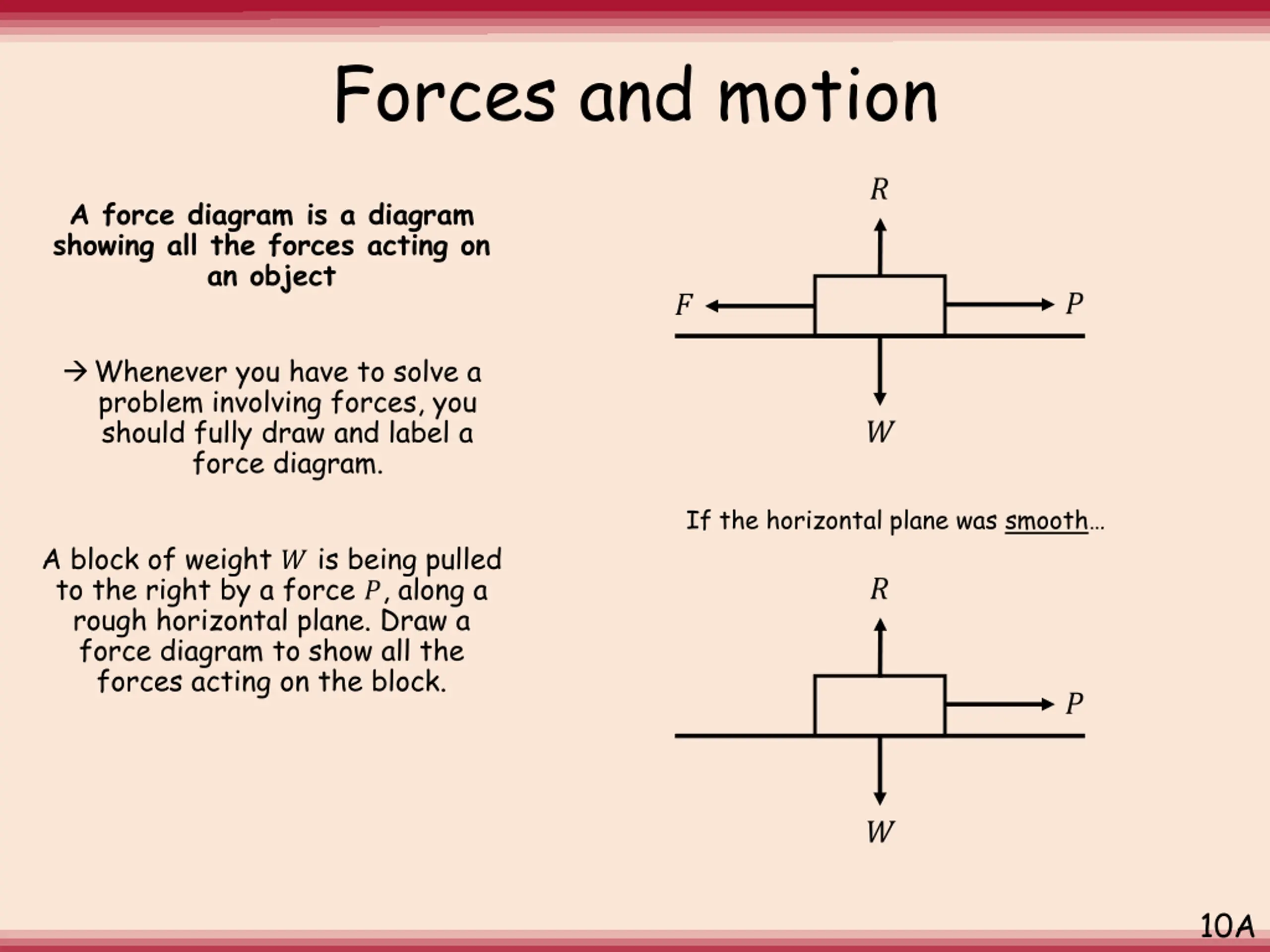 Forces and motion ? A force diagram is a diagram showing all the forces acting on an object ? ? Whenever you have to solve a problem involving forces, you should fully draw and label a force diagram. ? If the horizontal plane was smooth A block of weight ? is being pulled to the right by a force ?, along a rough horizontal plane. Draw a force diagram to show all the forces acting on the block. ? ? ? 10A
