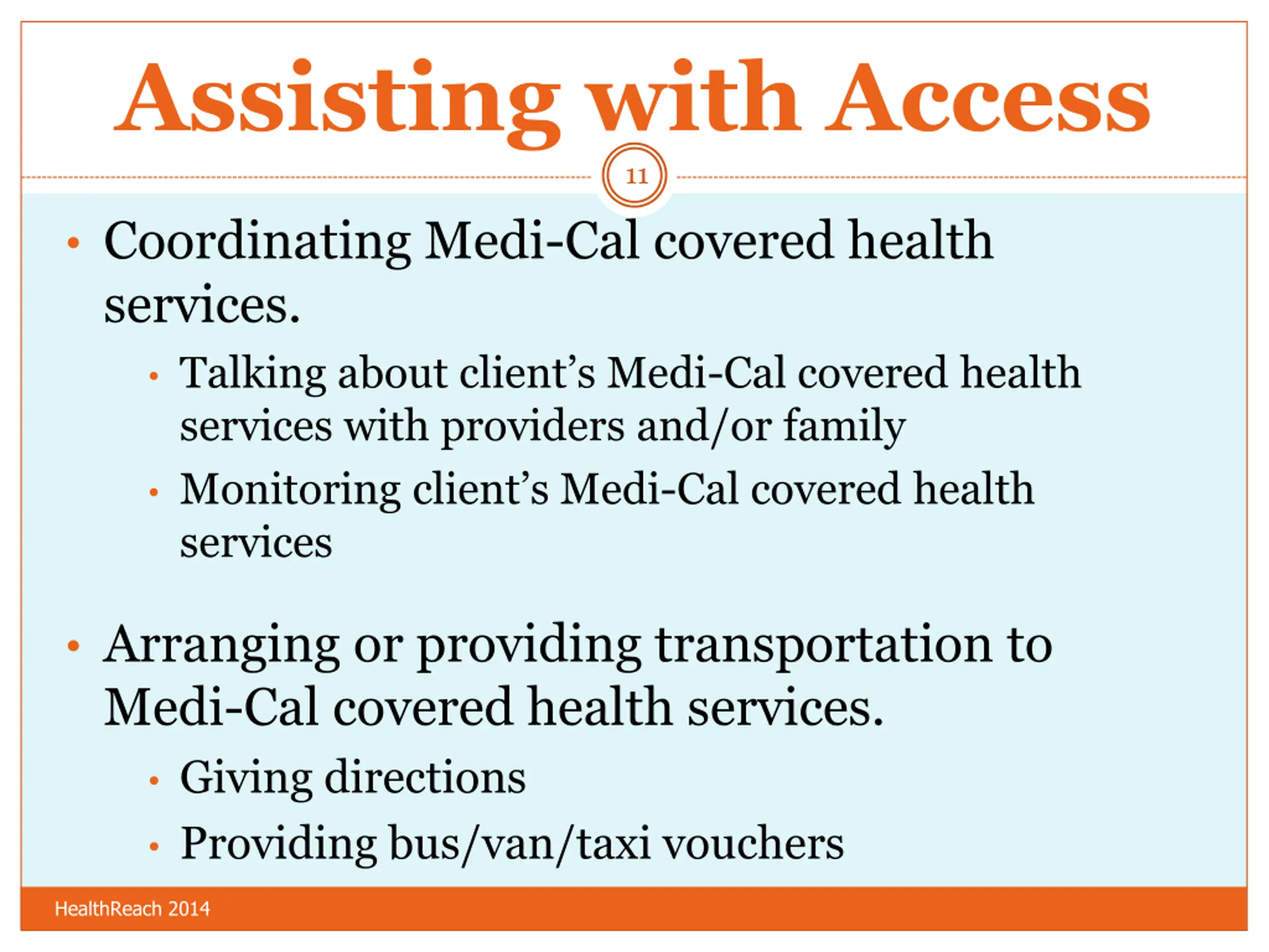 Assisting with Access 11 Coordinating Medi-Cal covered health services. Talking about client s Medi-Cal covered health services with providers and/or family Monitoring client s Medi-Cal covered health services Arranging or providing transportation to Medi-Cal covered health services. Giving directions Providing bus/van/taxi vouchers HealthReach 2014