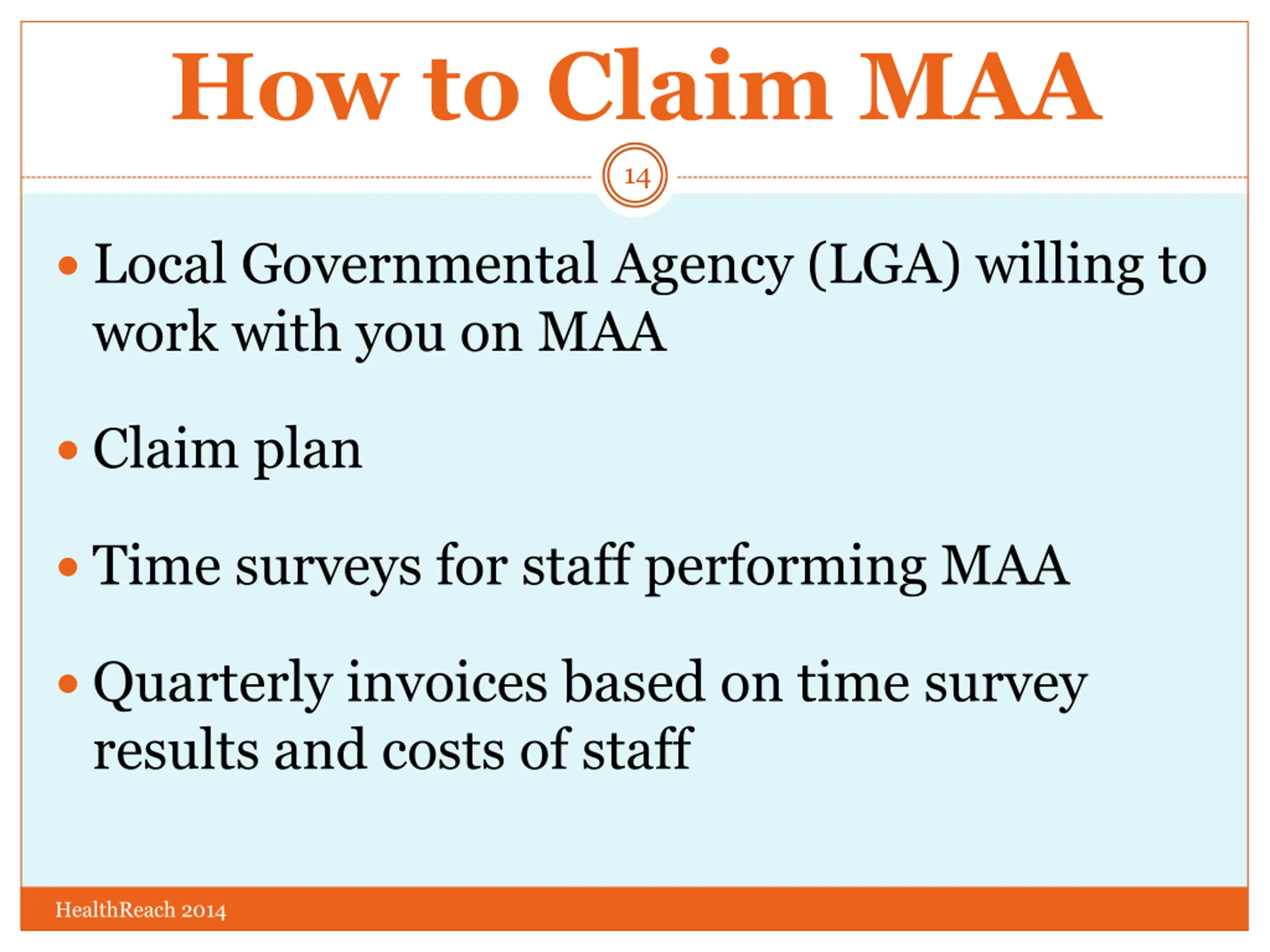 How to Claim MAA 14 Local Governmental Agency (LGA) willing to work with you on MAA Claim plan Time surveys for staff performing MAA Quarterly invoices based on time survey results and costs of staff HealthReach 2014