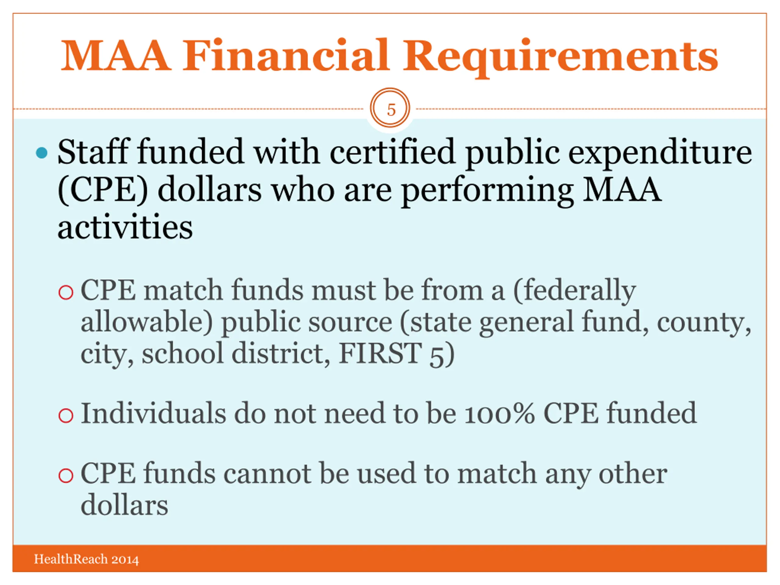 MAA Financial Requirements 5 Staff funded with certified public expenditure (CPE) dollars who are performing MAA activities CPE match funds must be from a (federally allowable) public source (state general fund, county, city, school district, FIRST 5) Individuals do not need to be 100% CPE funded CPE funds cannot be used to match any other dollars HealthReach 2014