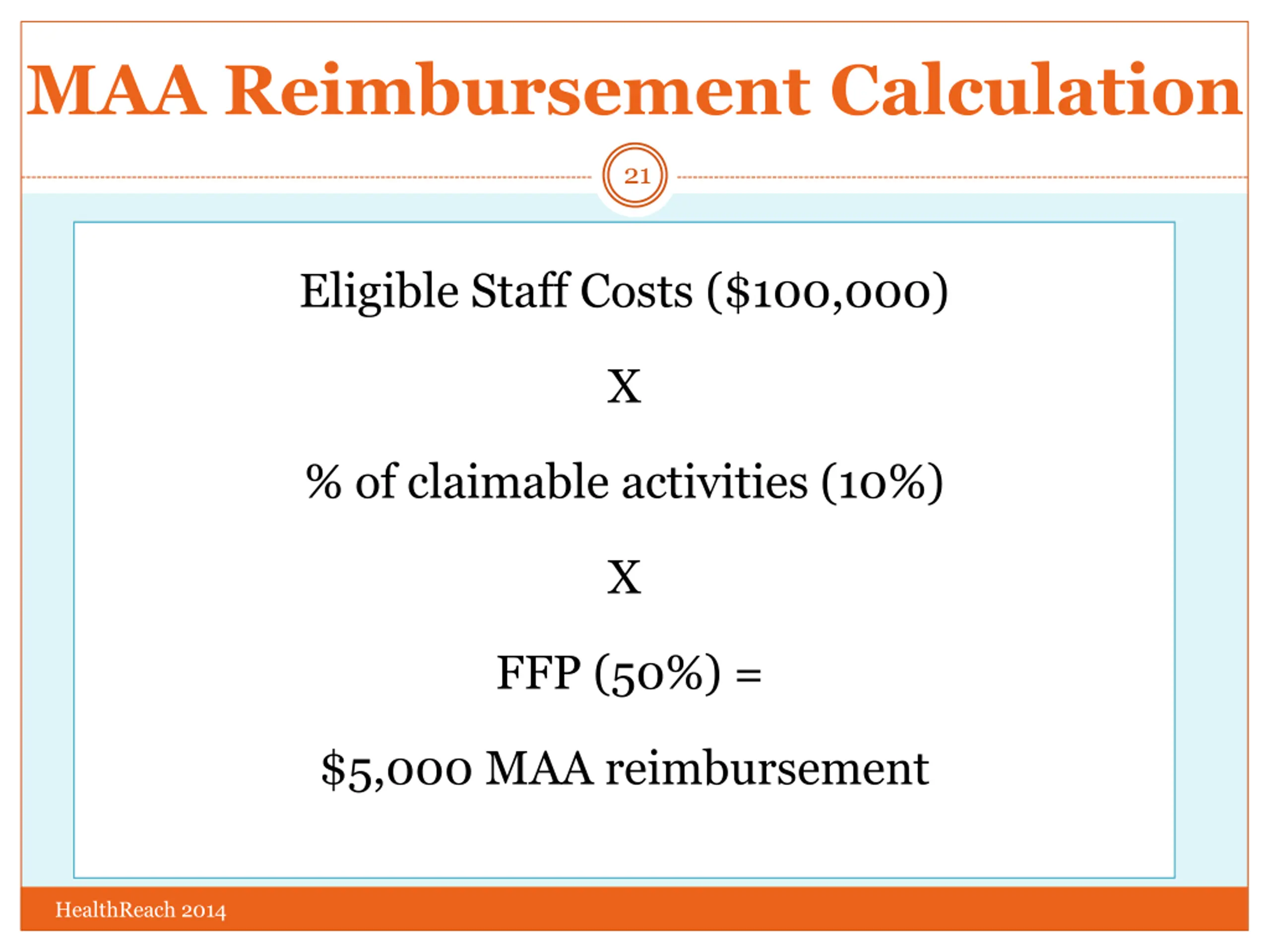 MAA Reimbursement Calculation 21 Eligible Staff Costs ($100,000) X % of claimable activities (10%) X FFP (50%) = $5,000 MAA reimbursement HealthReach 2014