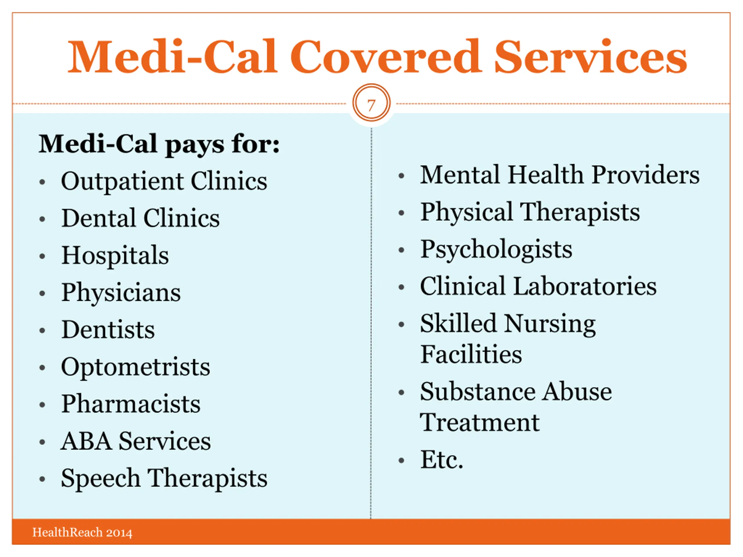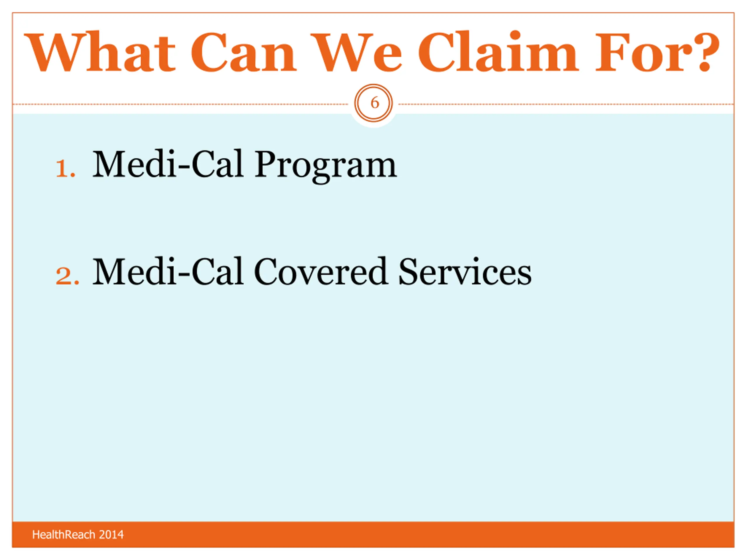 What Can We Claim For? 6 1. Medi-Cal Program 2. Medi-Cal Covered Services HealthReach 2014