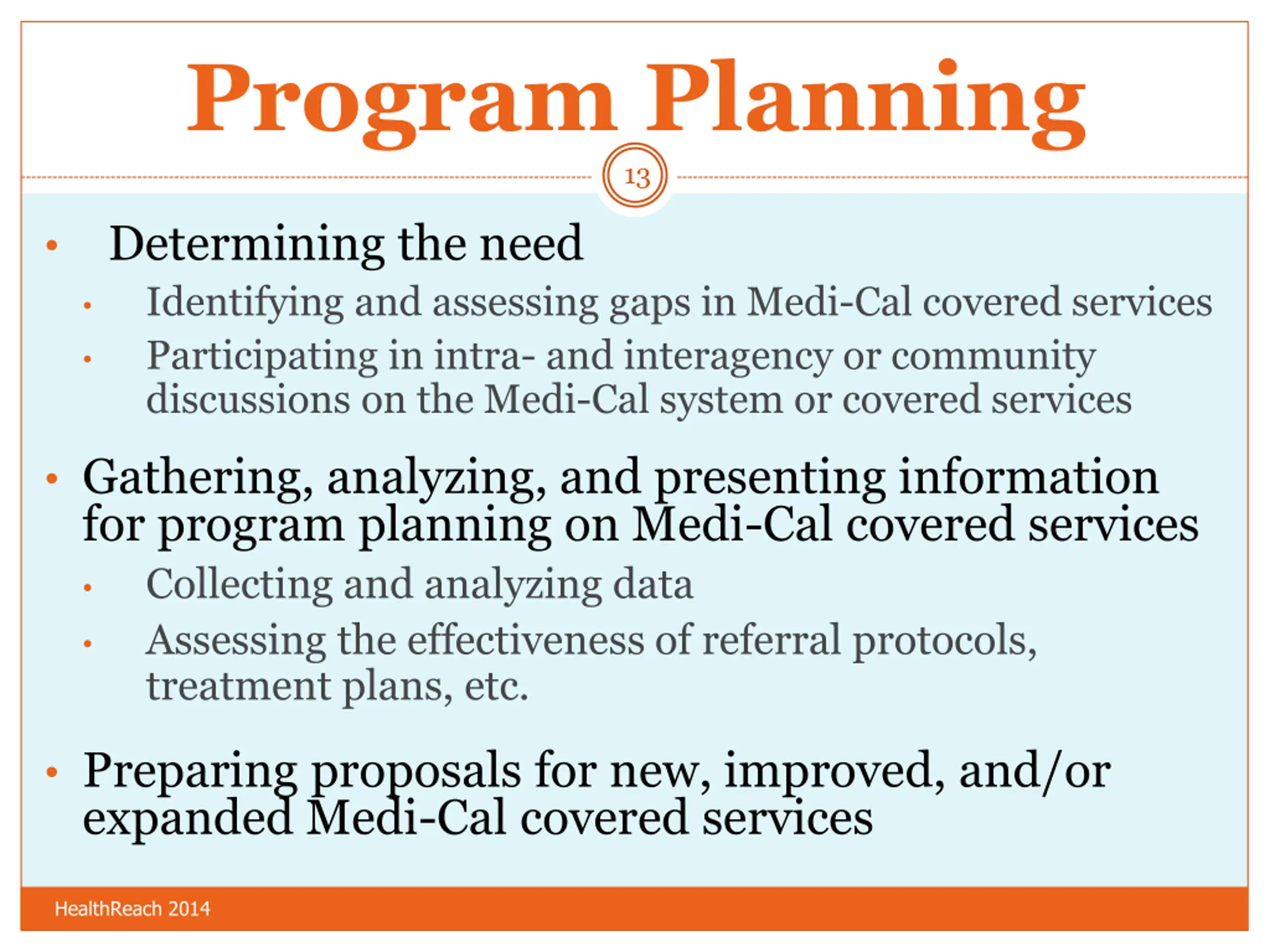 Program Planning 13 Determining the need Identifying and assessing gaps in Medi-Cal covered services Participating in intra- and interagency or community discussions on the Medi-Cal system or covered services Gathering, analyzing, and presenting information for program planning on Medi-Cal covered services Collecting and analyzing data Assessing the effectiveness of referral protocols, treatment plans, etc. Preparing proposals for new, improved, and/or expanded Medi-Cal covered services HealthReach 2014