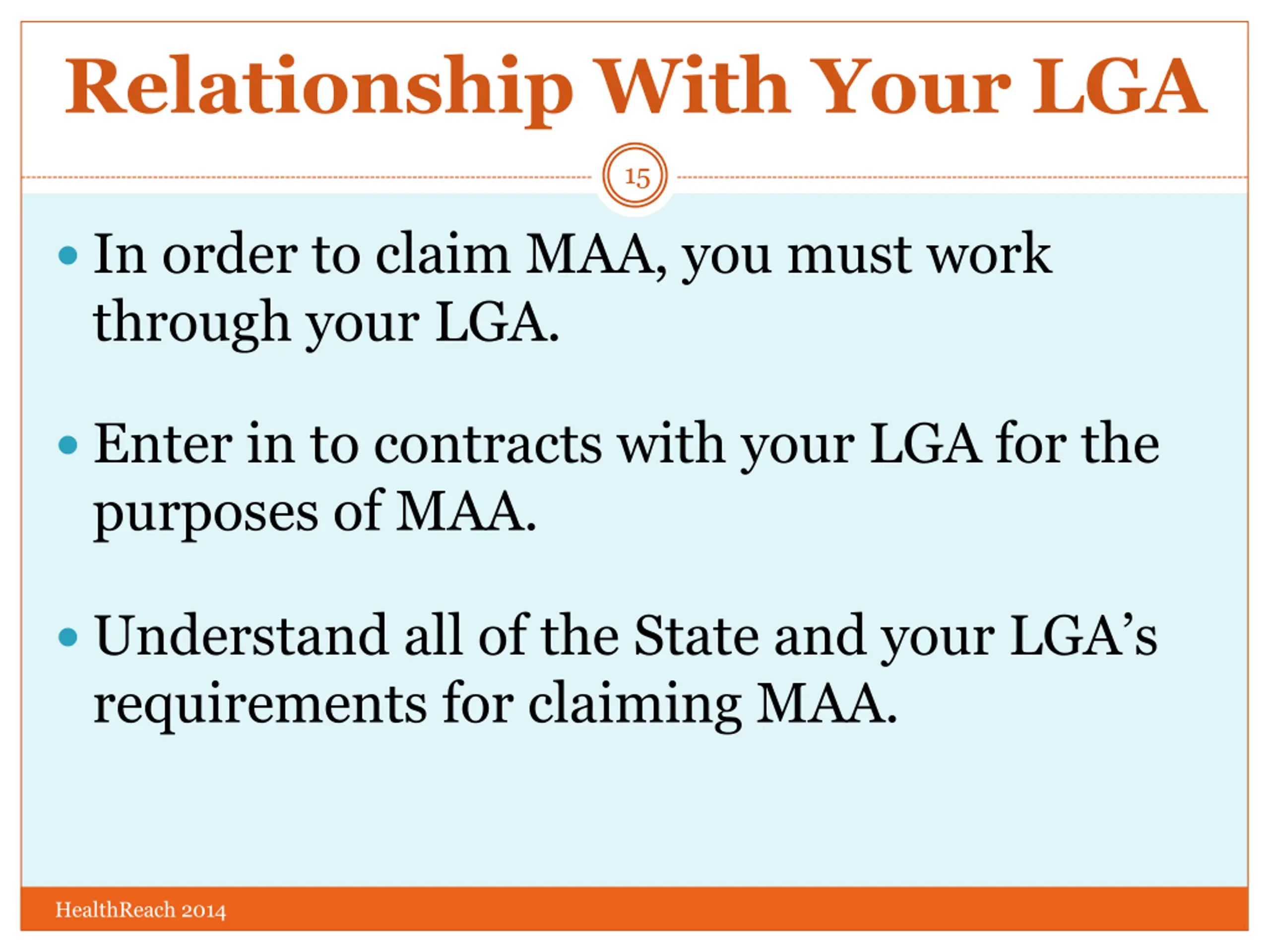 Relationship With Your LGA 15 In order to claim MAA, you must work through your LGA. Enter in to contracts with your LGA for the purposes of MAA. Understand all of the State and your LGA s requirements for claiming MAA. HealthReach 2014