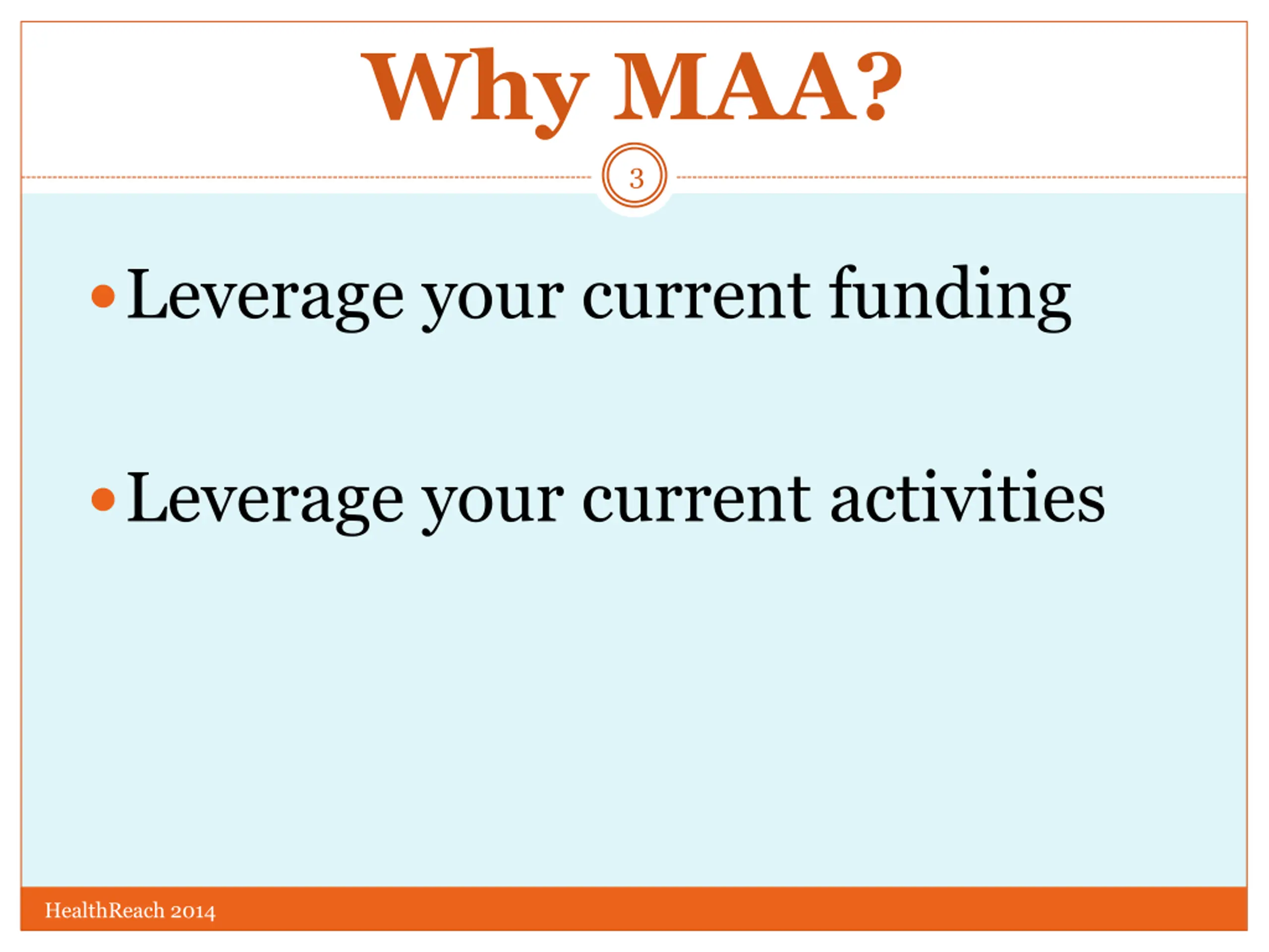 Why MAA? 3 Leverage your current funding Leverage your current activities HealthReach 2014