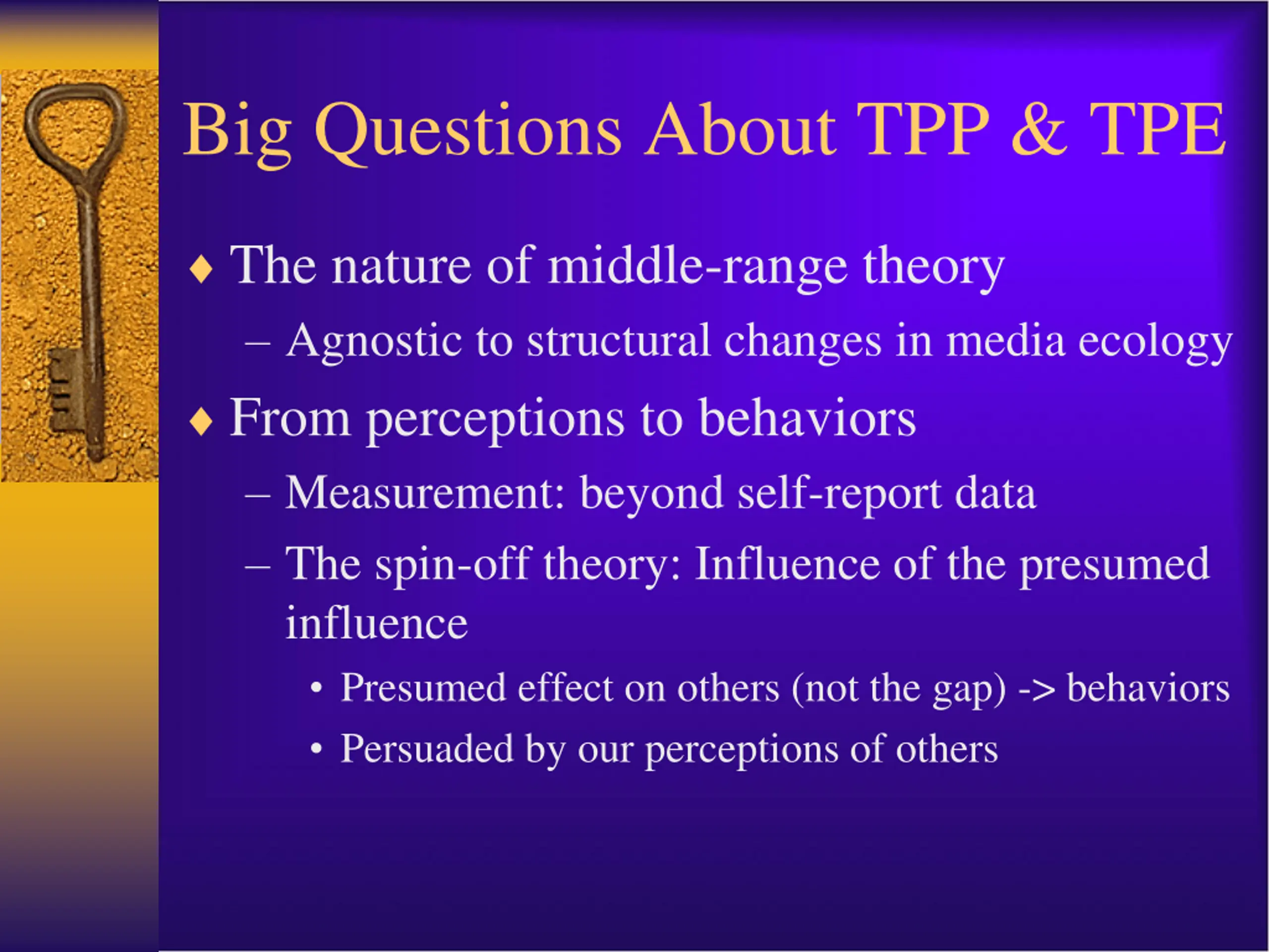 Big Questions About TPP & TPE The nature of middle-range theory Agnostic to structural changes in media ecology From perceptions to behaviors Measurement: beyond self-report data The spin-off theory: Influence of the presumed influence Presumed effect on others (not the gap) -> behaviors Persuaded by our perceptions of others