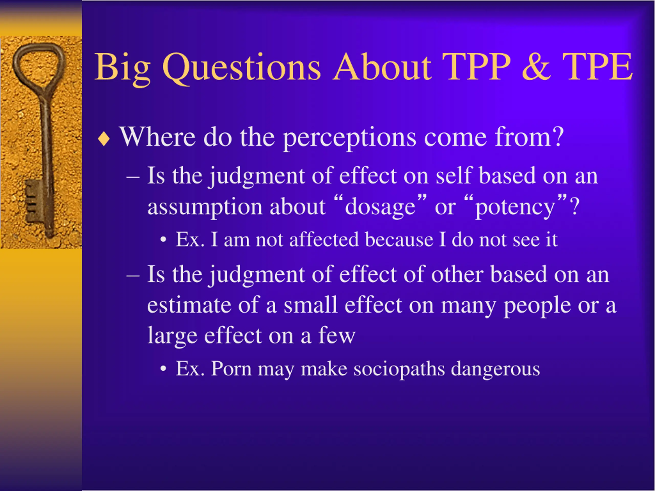 Big Questions About TPP & TPE Where do the perceptions come from? Is the judgment of effect on self based on an assumption about dosage or potency ? Ex. I am not affected because I do not see it Is the judgment of effect of other based on an estimate of a small effect on many people or a large effect on a few Ex. Porn may make sociopaths dangerous