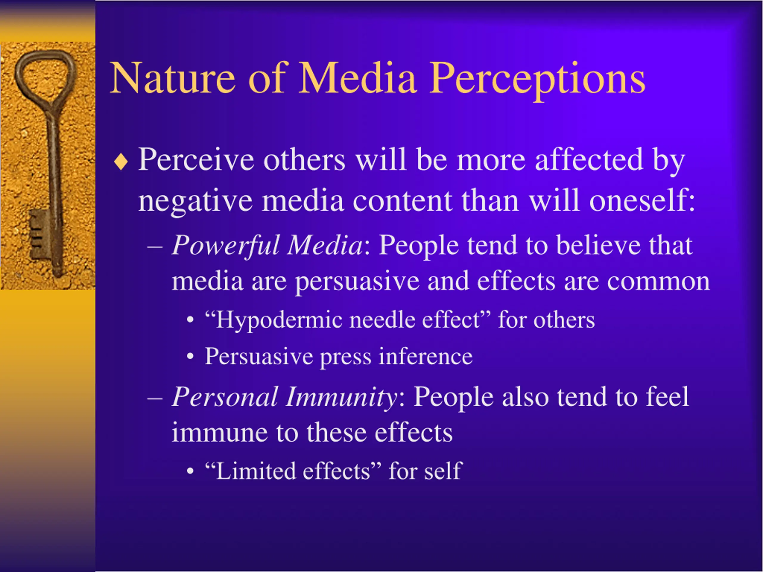 Nature of Media Perceptions Perceive others will be more affected by negative media content than will oneself: Powerful Media: People tend to believe that media are persuasive and effects are common Hypodermic needle effect for others Persuasive press inference Personal Immunity: People also tend to feel immune to these effects Limited effects for self