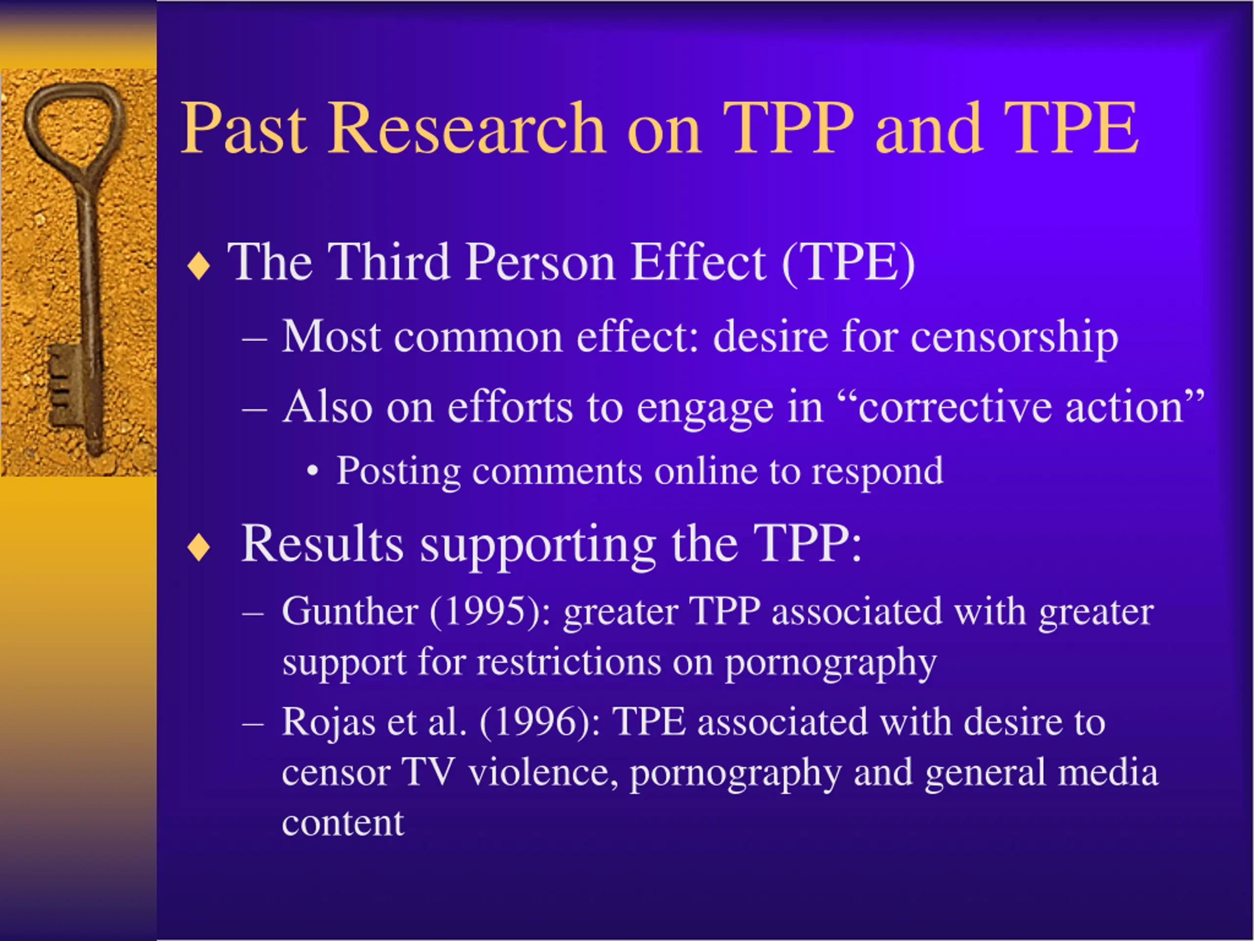 Past Research on TPP and TPE The Third Person Effect (TPE) Most common effect: desire for censorship Also on efforts to engage in corrective action Posting comments online to respond Results supporting the TPP: Gunther (1995): greater TPP associated with greater support for restrictions on pornography Rojas et al. (1996): TPE associated with desire to censor TV violence, pornography and general media content
