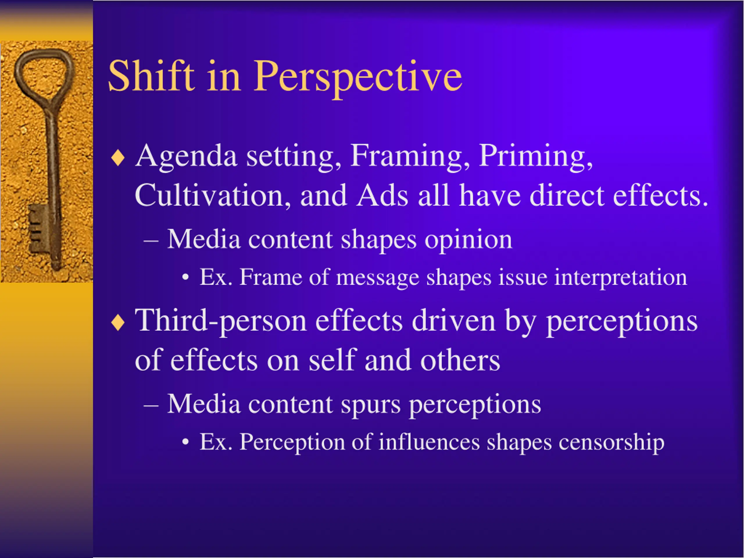 Shift in Perspective Agenda setting, Framing, Priming, Cultivation, and Ads all have direct effects. Media content shapes opinion Ex. Frame of message shapes issue interpretation Third-person effects driven by perceptions of effects on self and others Media content spurs perceptions Ex. Perception of influences shapes censorship