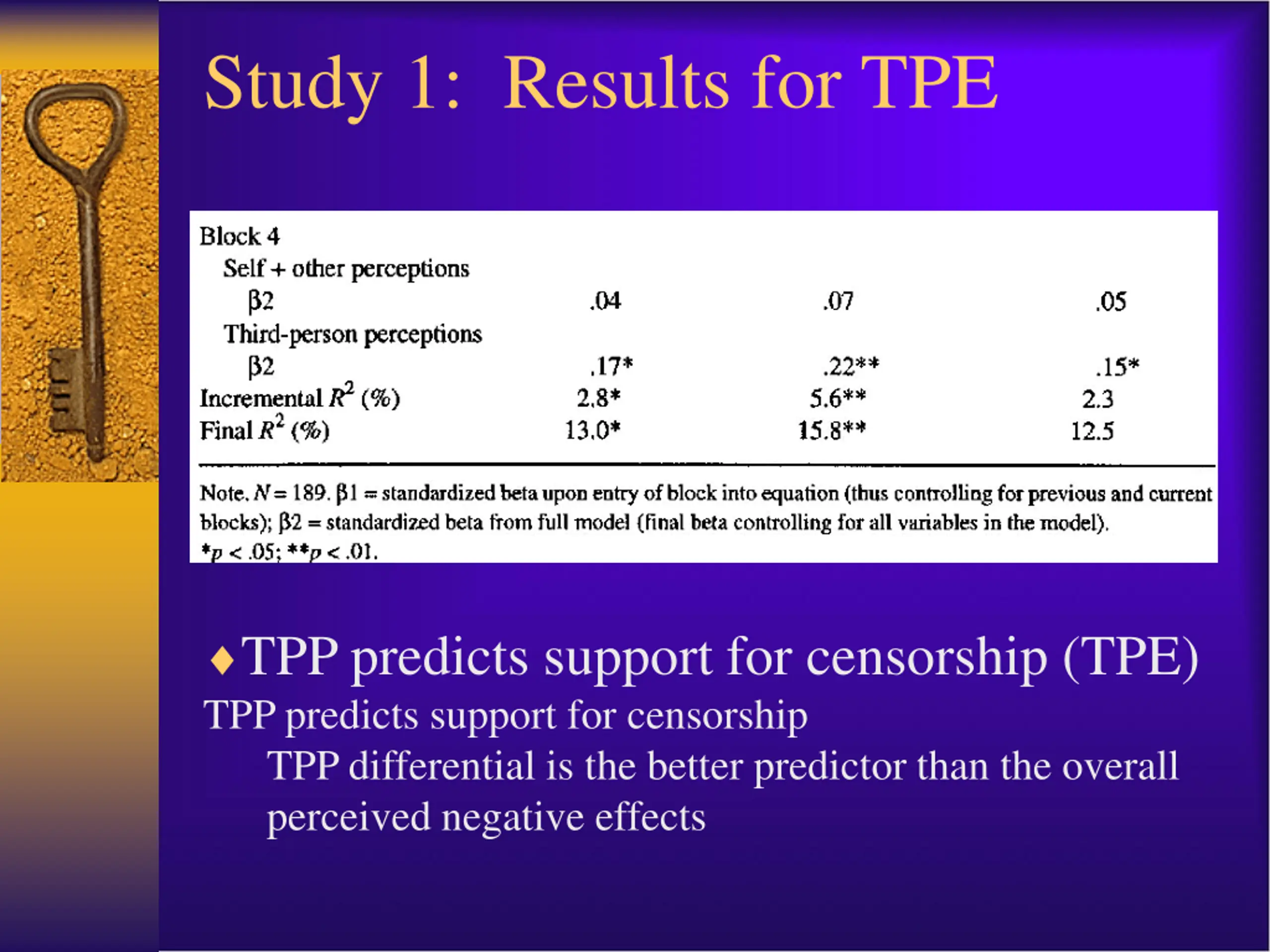Study 1: Results for TPE TPP predicts support for censorship (TPE) TPP predicts support for censorship TPP differential is the better predictor than the overall perceived negative effects