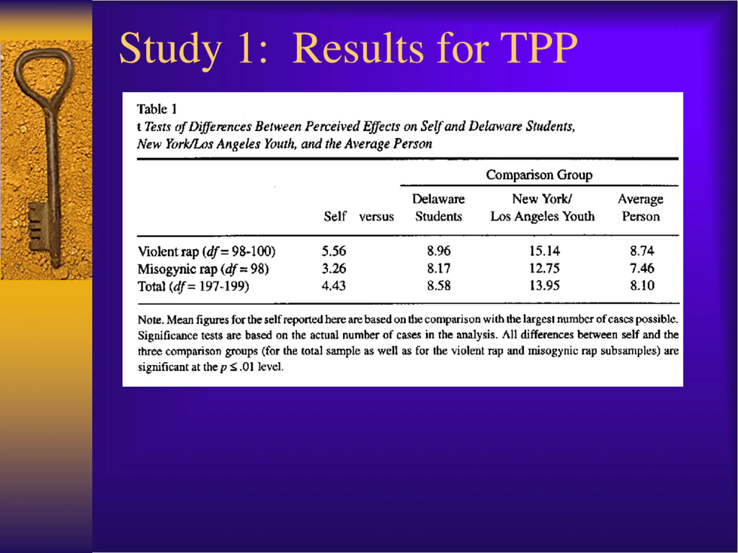 Antecedents and Consequences Study 1: McLeod et al. (1997) Support for censorship of violent and misogynic rap lyrics: An analysis of the third-person effect Comm Research Study 2: McLeod et al. (2001) Behind the Third-person Effect: Differentiating Perceptual Processes for Self and Other Journal of Comm. Research Questions: TPP occur for violent and misogynistic music? Is there a connection between TPP and TPE? Who is seen as most affected by negative influence? What explains who perceives others as more affected?
