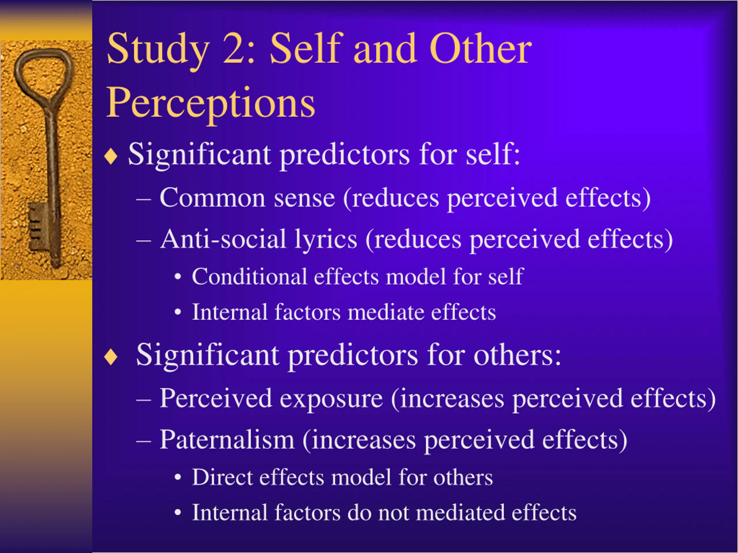 Study 2: Self and Other Perceptions Significant predictors for self: Common sense (reduces perceived effects) Anti-social lyrics (reduces perceived effects) Conditional effects model for self Internal factors mediate effects Significant predictors for others: Perceived exposure (increases perceived effects) Paternalism (increases perceived effects) Direct effects model for others Internal factors do not mediated effects