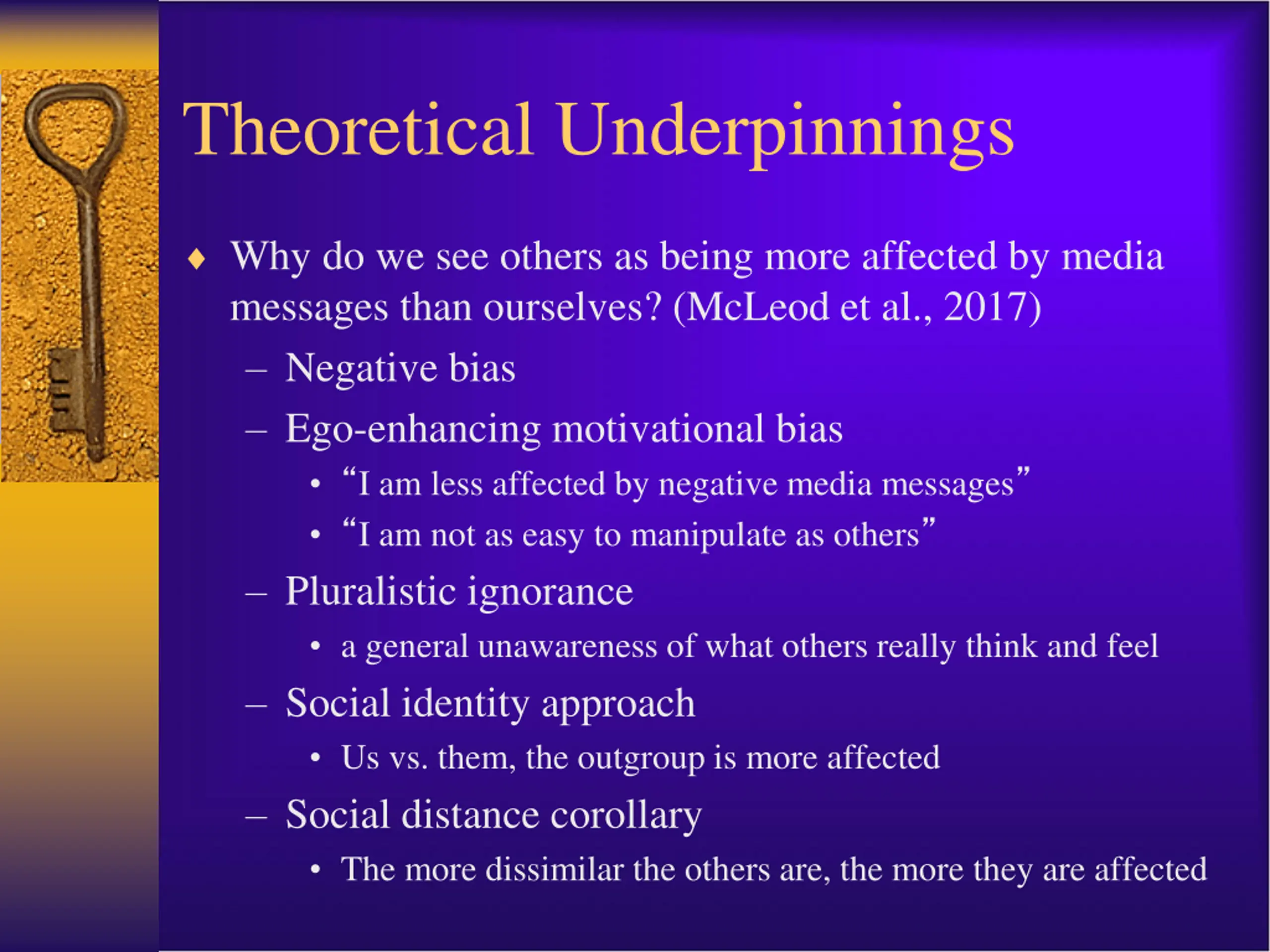 Theoretical Underpinnings Why do we see others as being more affected by media messages than ourselves? (McLeod et al., 2017) Negative bias Ego-enhancing motivational bias I am less affected by negative media messages I am not as easy to manipulate as others Pluralistic ignorance a general unawareness of what others really think and feel Social identity approach Us vs. them, the outgroup is more affected Social distance corollary The more dissimilar the others are, the more they are affected