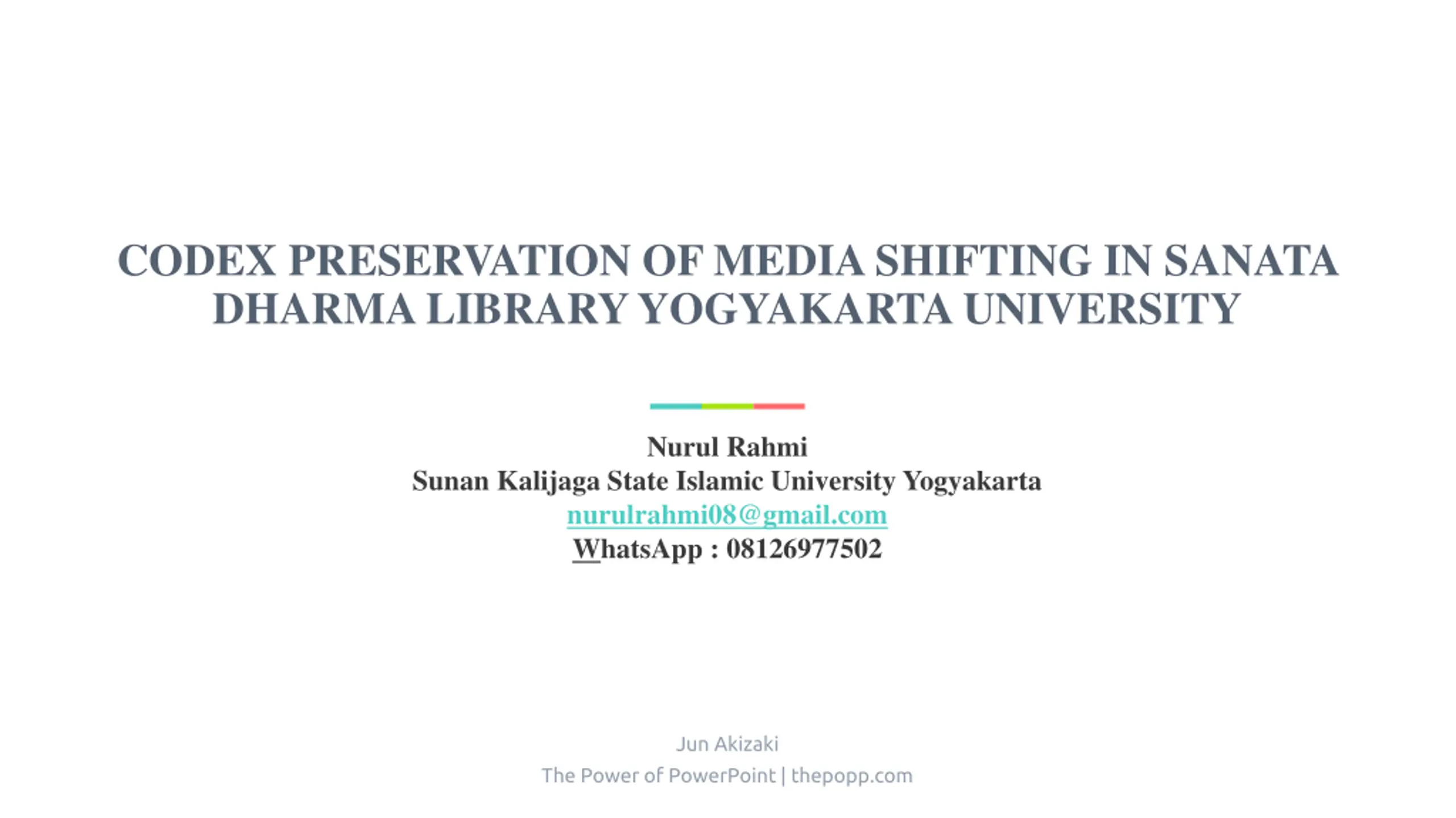 CODEX PRESERVATION OF MEDIA SHIFTING IN SANATA DHARMA LIBRARY YOGYAKARTA UNIVERSITY Nurul Rahmi Sunan Kalijaga State Islamic University Yogyakarta nurulrahmi08@gmail.com WhatsApp : 08126977502 Jun Akizaki The Power of PowerPoint | thepopp.com