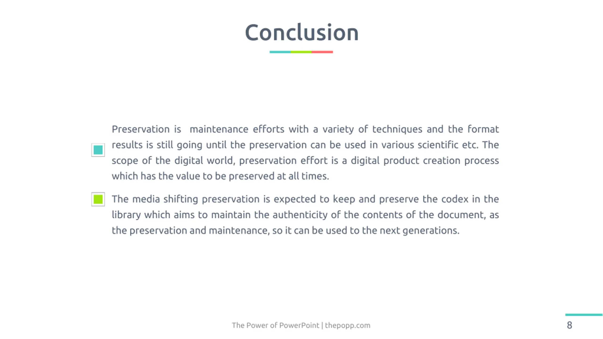 Conclusion Preservation is maintenance efforts with a variety of techniques and the format results is still going until the preservation can be used in various scientific etc. The scope of the digital world, preservation effort is a digital product creation process which has the value to be preserved at all times. The media shifting preservation is expected to keep and preserve the codex in the library which aims to maintain the authenticity of the contents of the document, as the preservation and maintenance, so it can be used to the next generations. 8 The Power of PowerPoint | thepopp.com