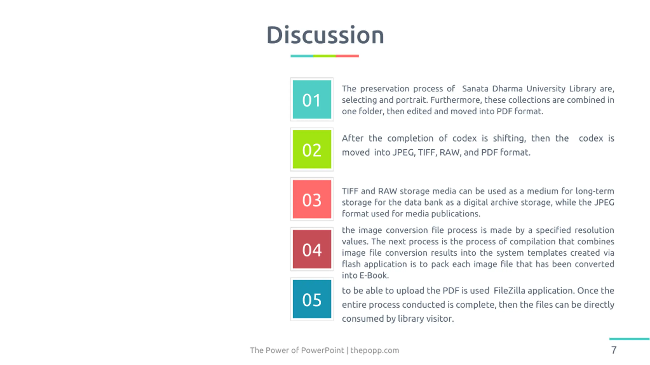 Discussion The preservation process of Sanata Dharma University Library are, selecting and portrait. Furthermore, these collections are combined in one folder, then edited and moved into PDF format. 01 After the completion of codex is shifting, then the moved into JPEG, TIFF, RAW, and PDF format. codex is 02 TIFF and RAW storage media can be used as a medium for long-term storage for the data bank as a digital archive storage, while the JPEG format used for media publications. 03 the image conversion file process is made by a specified resolution values. The next process is the process of compilation that combines image file conversion results into the system templates created via flash application is to pack each image file that has been converted into E-Book. 04 to be able to upload the PDF is used FileZilla application. Once the entire process conducted is complete, then the files can be directly consumed by library visitor. 05 7 The Power of PowerPoint | thepopp.com