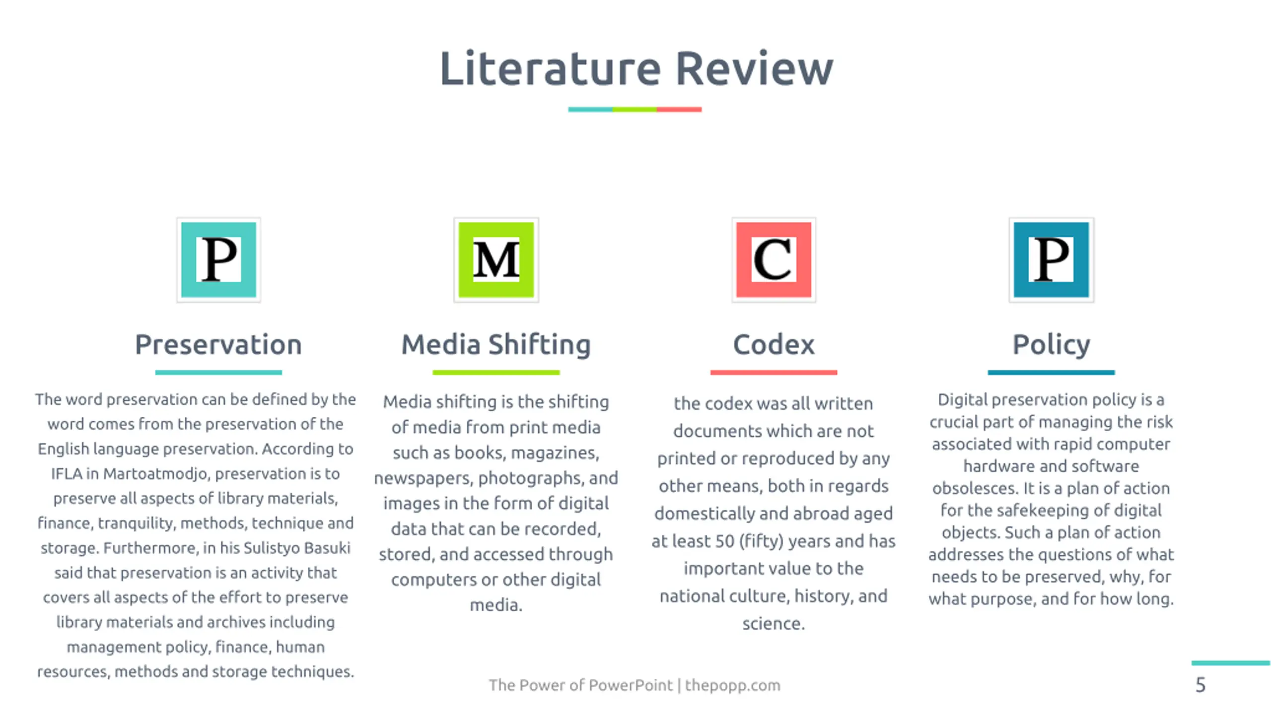 Literature Review Preservation Media Shifting Codex Policy Digital preservation policy is a crucial part of managing the risk associated with rapid computer hardware and software obsolesces. It is a plan of action for the safekeeping of digital objects. Such a plan of action addresses the questions of what needs to be preserved, why, for what purpose, and for how long. The word preservation can be defined by the word comes from the preservation of the English language preservation. According to IFLA in Martoatmodjo, preservation is to preserve all aspects of library materials, finance, tranquility, methods, technique and storage. Furthermore, in his Sulistyo Basuki said that preservation is an activity that covers all aspects of the effort to preserve library materials and archives including management policy, finance, human resources, methods and storage techniques. Media shifting is the shifting of media from print media such as books, magazines, newspapers, photographs, and images in the form of digital data that can be recorded, stored, and accessed through computers or other digital media. the codex was all written documents which are not printed or reproduced by any other means, both in regards domestically and abroad aged at least 50 (fifty) years and has important value to the national culture, history, and science. 5 The Power of PowerPoint | thepopp.com