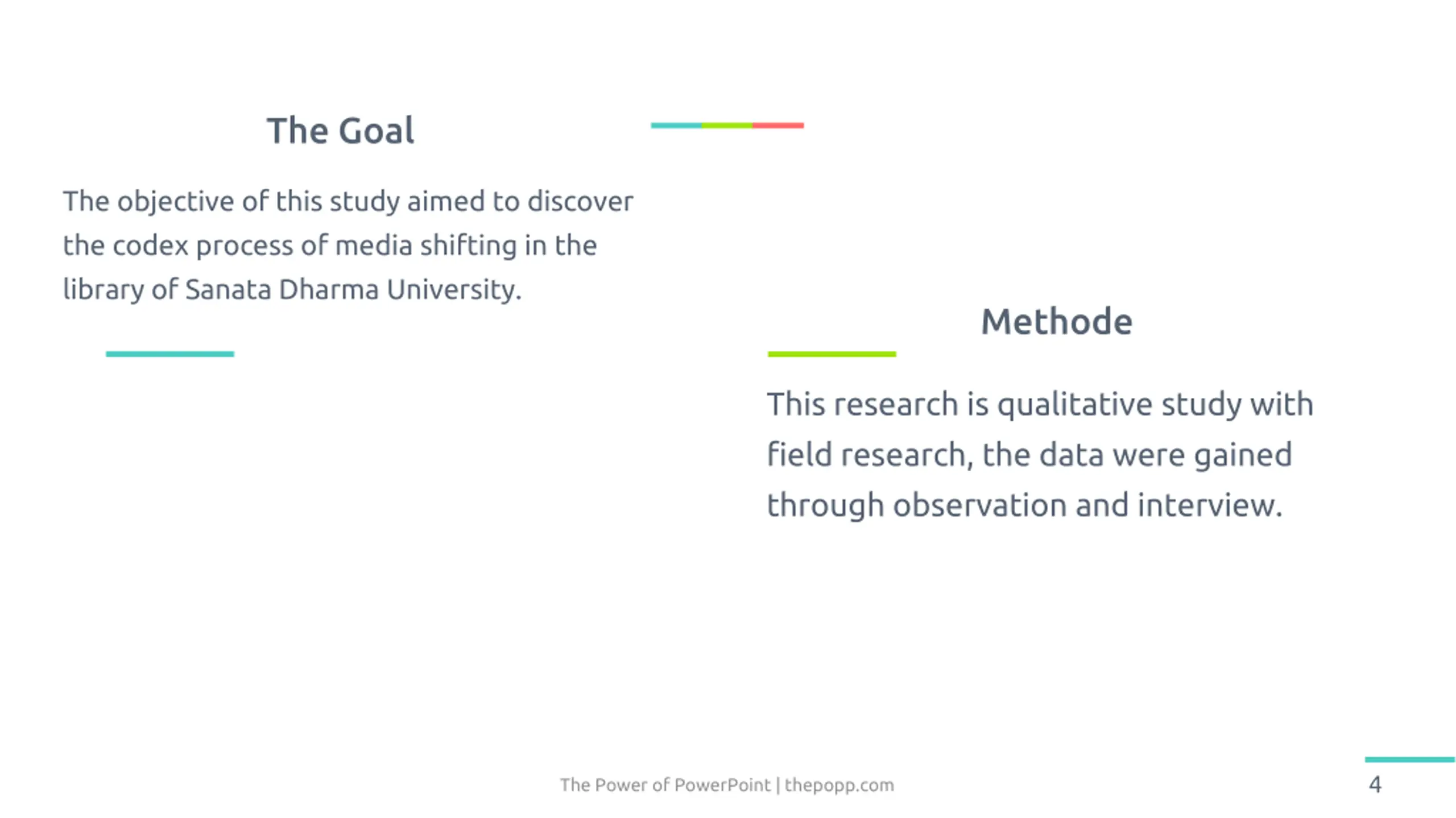 The Goal The objective of this study aimed to discover the codex process of media shifting in the library of Sanata Dharma University. Methode This research is qualitative study with field research, the data were gained through observation and interview. 4 The Power of PowerPoint | thepopp.com