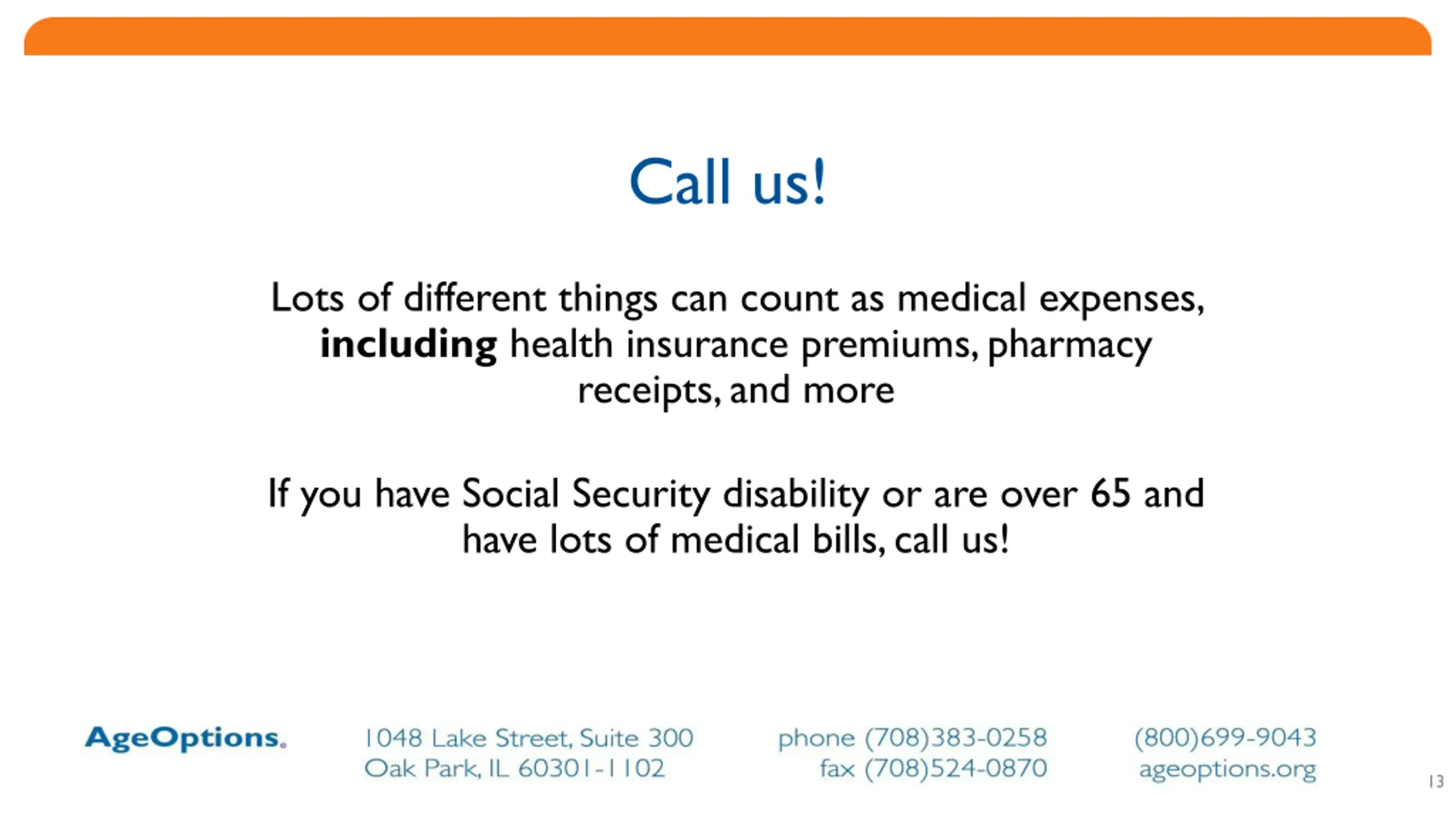 Call us! Lots of different things can count as medical expenses, including health insurance premiums, pharmacy receipts, and more If you have Social Security disability or are over 65 and have lots of medical bills, call us! 13
