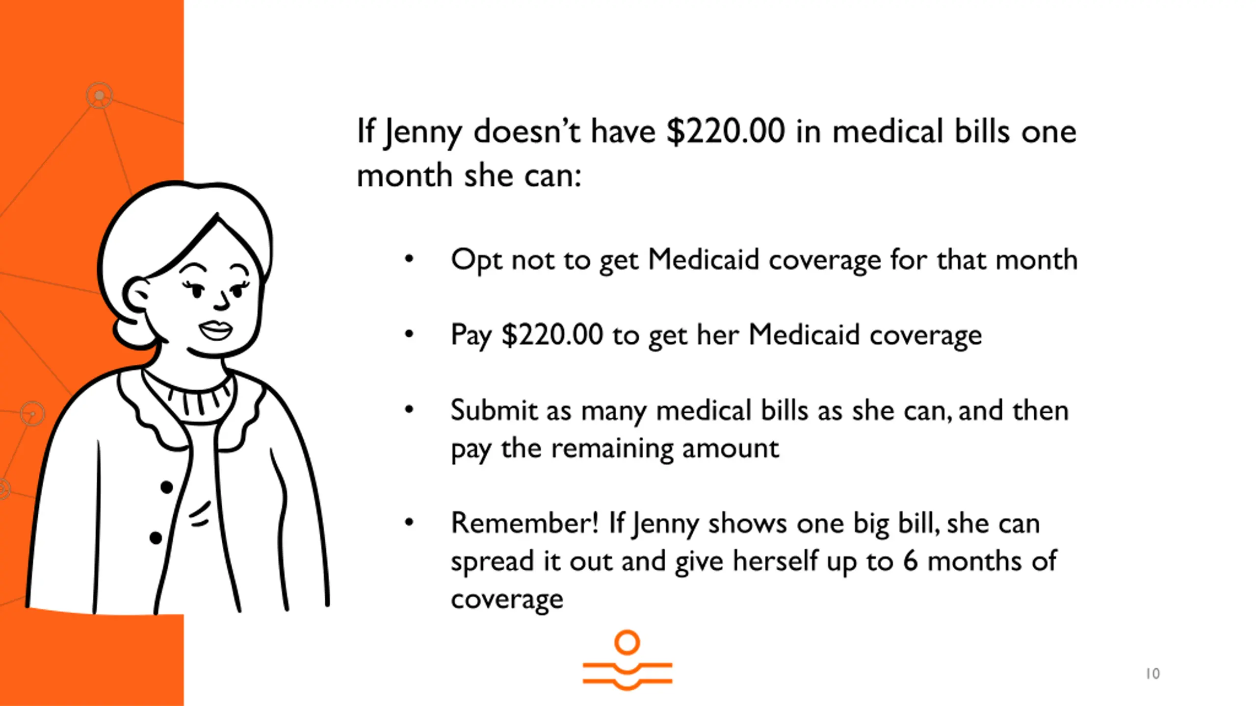 If Jenny doesnt have $220.00 in medical bills one month she can: Opt not to get Medicaid coverage for that month Pay $220.00 to get her Medicaid coverage Submit as many medical bills as she can, and then pay the remaining amount Remember! If Jenny shows one big bill, she can spread it out and give herself up to 6 months of coverage 10