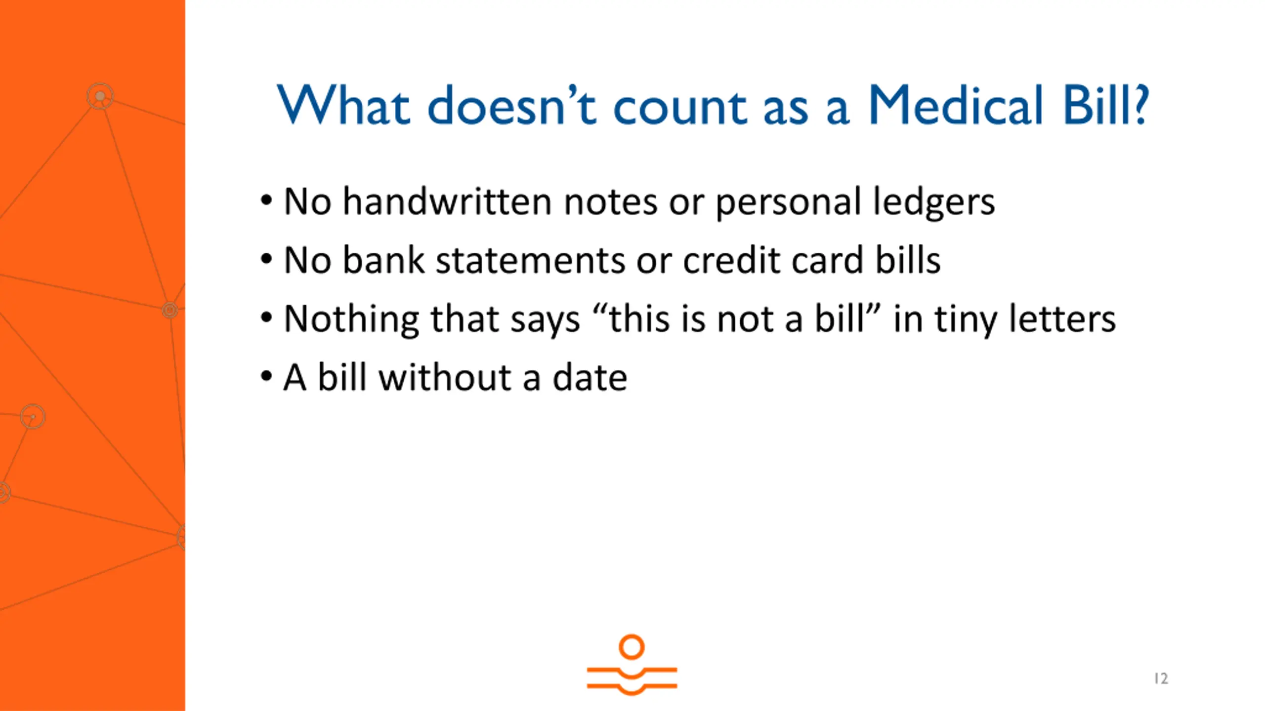 What doesnt count as a Medical Bill? No handwritten notes or personal ledgers No bank statements or credit card bills Nothing that says this is not a bill in tiny letters A bill without a date 12