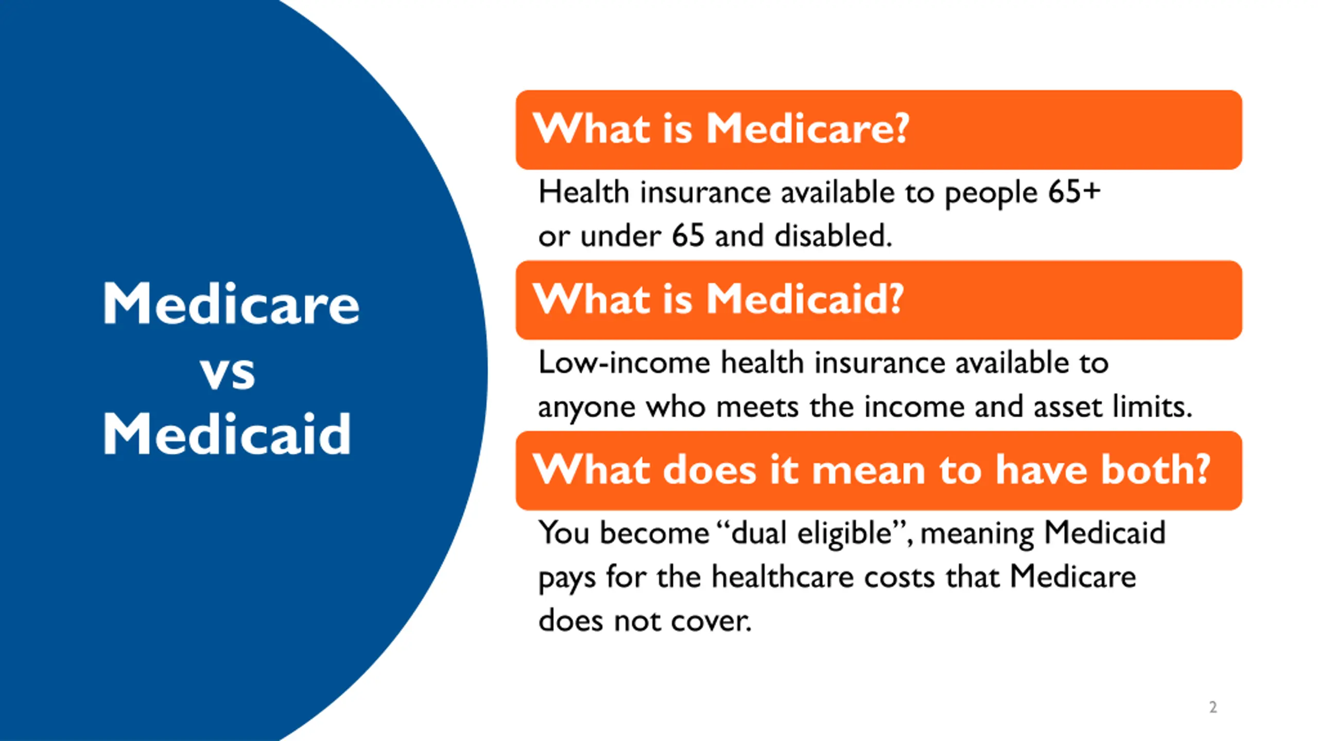 What is Medicare? Health insurance available to people 65+ or under 65 and disabled. What is Medicaid? Medicare vs Medicaid Low-income health insurance available to anyone who meets the income and asset limits. What does it mean to have both? You become dual eligible , meaning Medicaid pays for the healthcare costs that Medicare does not cover. 2