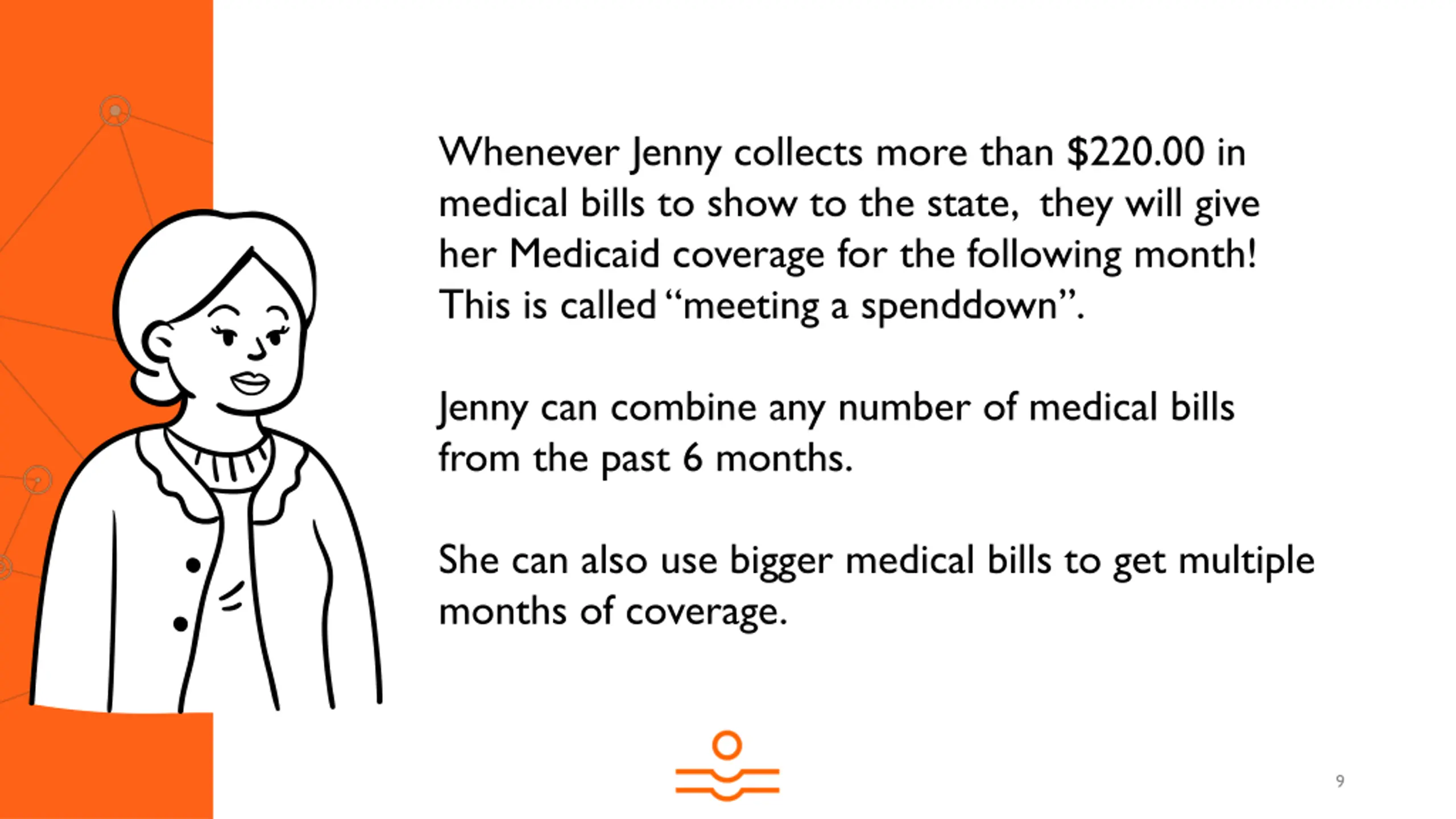 Whenever Jenny collects more than $220.00 in medical bills to show to the state, they will give her Medicaid coverage for the following month! This is called meeting a spenddown . Jenny can combine any number of medical bills from the past 6 months. She can also use bigger medical bills to get multiple months of coverage. 9